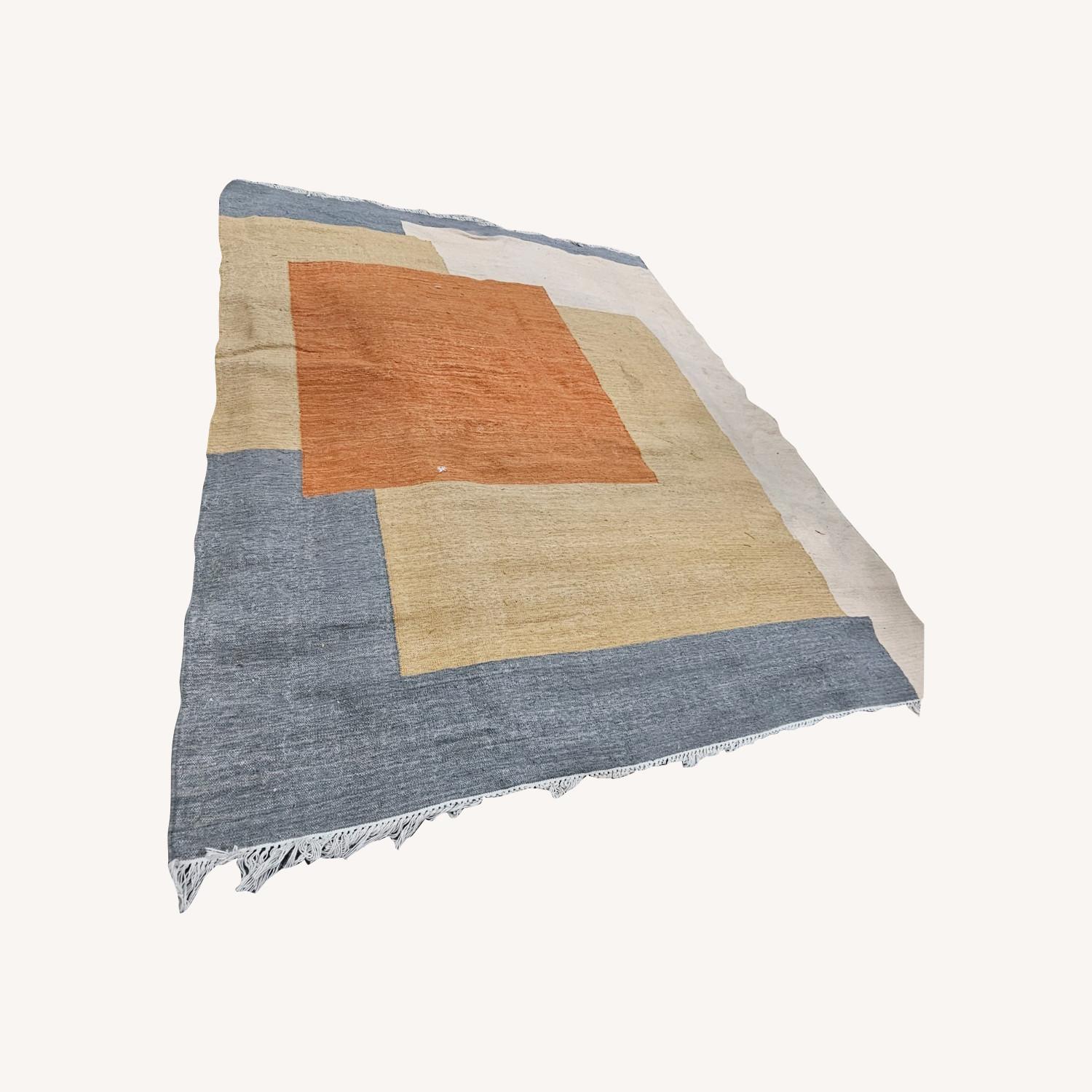 Seller's Notes:Featuring overlapping blocks of color in beautiful blues, blush and terracotta, the Bennett make a bold statement. Woven with recycled polyester, this is an eco-friendly, durable flatweave. This items does show signs of use but has years of life left in it. It has been cleaned but the marks showing in the photos did not come out. With a deep clean, you may see some improvements.