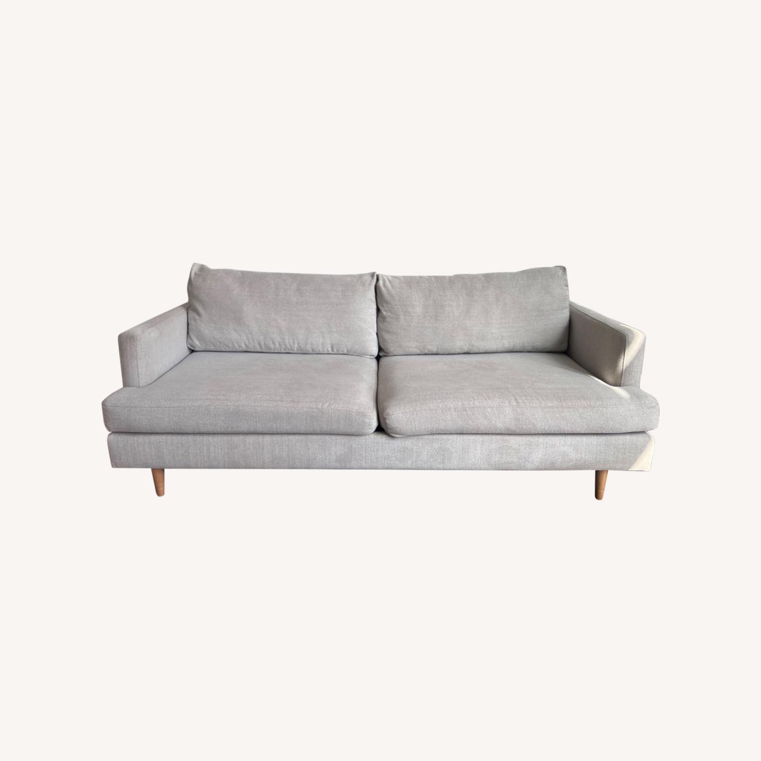 Seller's Notes:Stylish mid-century modern sofa with light gray upholstery, light wood legs, and plush cushions. Some minor signs of wear/discoloration to frame of sofa. Cushion covers are all machine washable, making it easy to keep clean! Very comfortable as well.