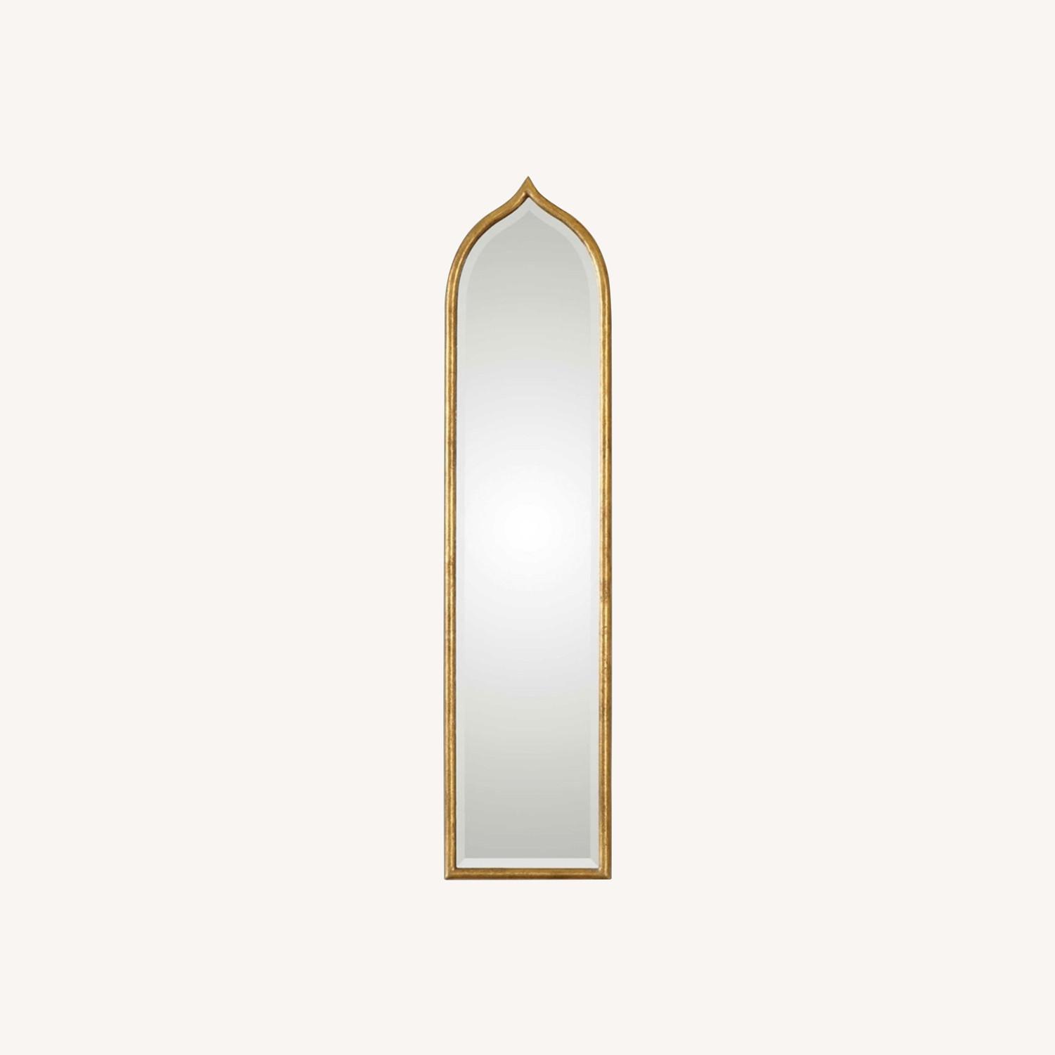 Seller's Notes:Beautiful rounded, gold leaf frame-finished antique looking mirror that’s perfect for a small apartment. It has a generous 1 1/4" bevel.