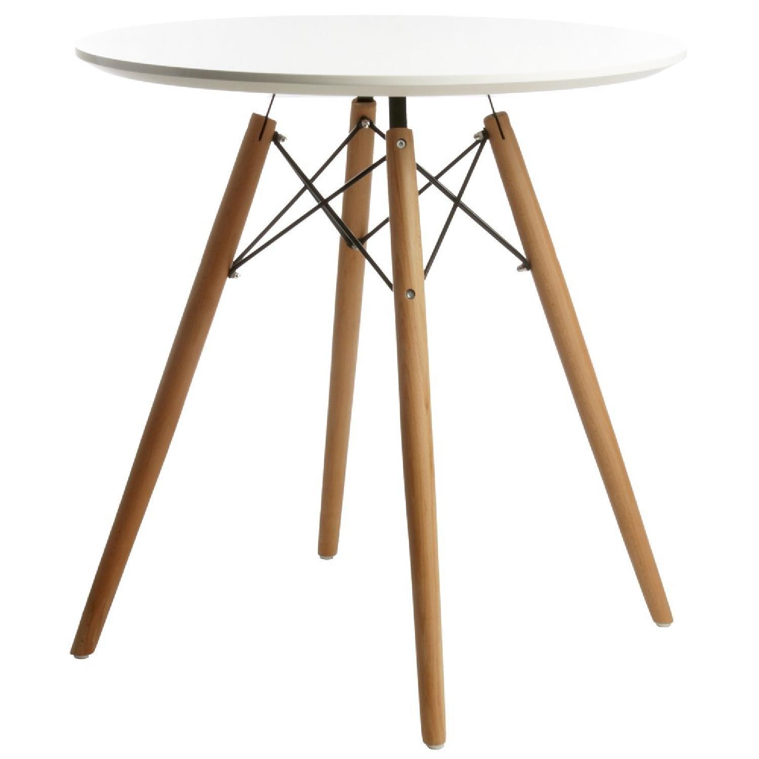 Seller's Notes:Charles Eames replica dining table good for small dining area or breakfast nook. Some scuffs on the top from regular use but overall in quite good condition. Top is white fiber glass. Legs are wood with thin black metal bracing