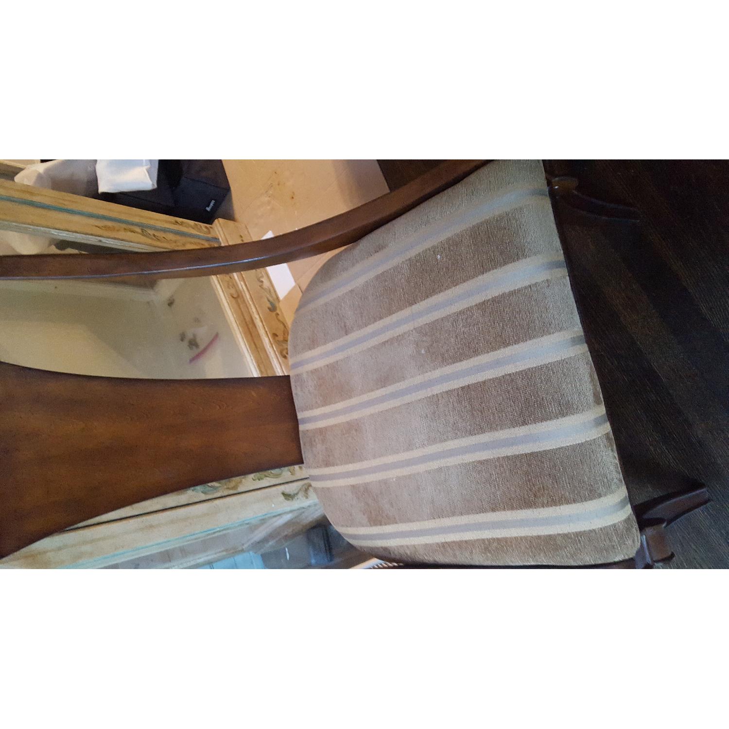Seller's Notes:A lovely 54" round table with inlaid wood design. Easily seats 6. Additional 12" leaf included as well as four very comfy chairs. Sadly, too big for our new space. 1" chip to edge of table, barely noticeable. Upholstery a bit faded...can be redone or fine as is. Very solid and well made.