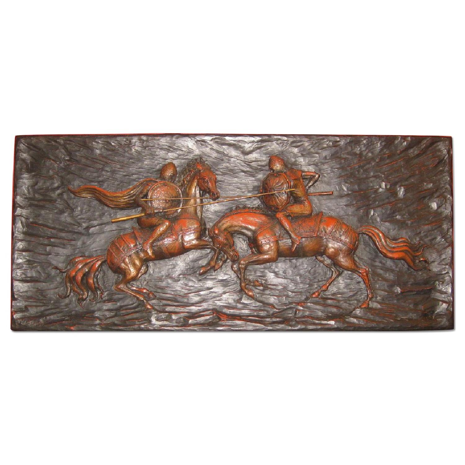 Seller's Notes:This classic Mid-Century art piece is an authentic Finesse Originals from the 1960s or 70s. Made of hand poured fiberglass. The detail in this cast is amazing and has kept very well. There’s a tag in the back with the word “Lancer” written on it. I suppose this is the name of this piece, but its known as “Jousting Knights”. In any case, this is an excellent work of art and would make a great addition to anyone’s collection.