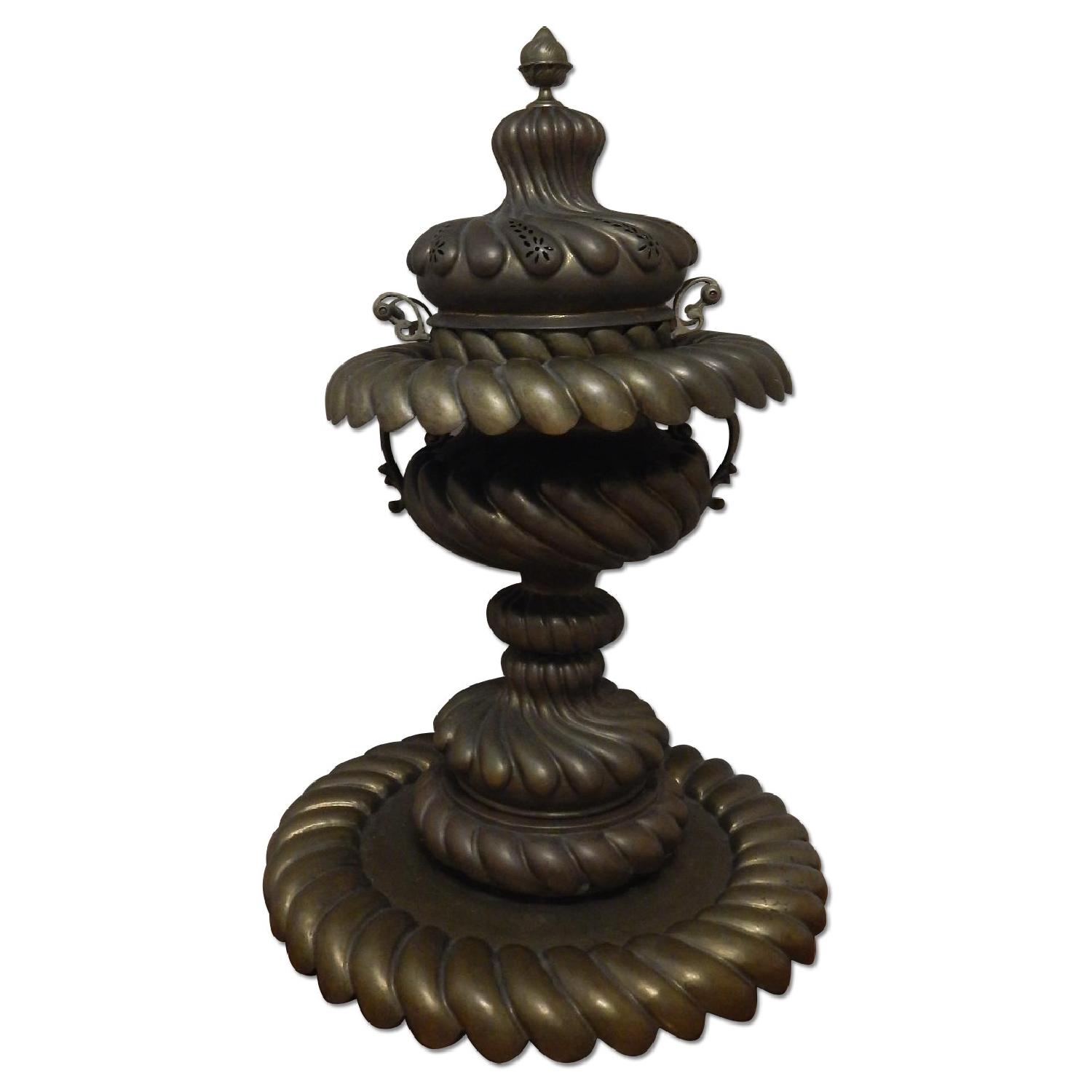 Seller's Notes:The brazier, which is an important artifact in the daily life of the Turkish people can be defined as a copper, brass, metal or baked clay vessel used for burning coal (charcoal), for heating closed spaces or for cooking purposes. The brazier consisted of these parts: a) The tray, or tabla: This was placed under the vessel to catch sparks spitting out of the fire. It was a circular object, made of wood, and plated with copper or brass, separated from the brazier, which could be put away if necessary. b) The base and body, known collectively as the 'govde': This consisted of the base or foot resting on the tray and the part in which the ashbowl was placed, which was known as the 'cradle' of the bowl -canak yuvasi- or hearth - ocak-. c) The fire bowl -or ateslik: known as the canak in copper circles- pot, bowl. This is the two handled vessel in which the coals are placed. It is not a permanent part of the brazier, but can be removed. This part is popularly known as the 'belly of the brazier'. d) The cover, or kapak: This covers the ash-bowl, and is generally conical, decorated with pierced work and has a node handle at the finial. This brazier is 24" in diameter and 40" high and weighs 38 pounds.