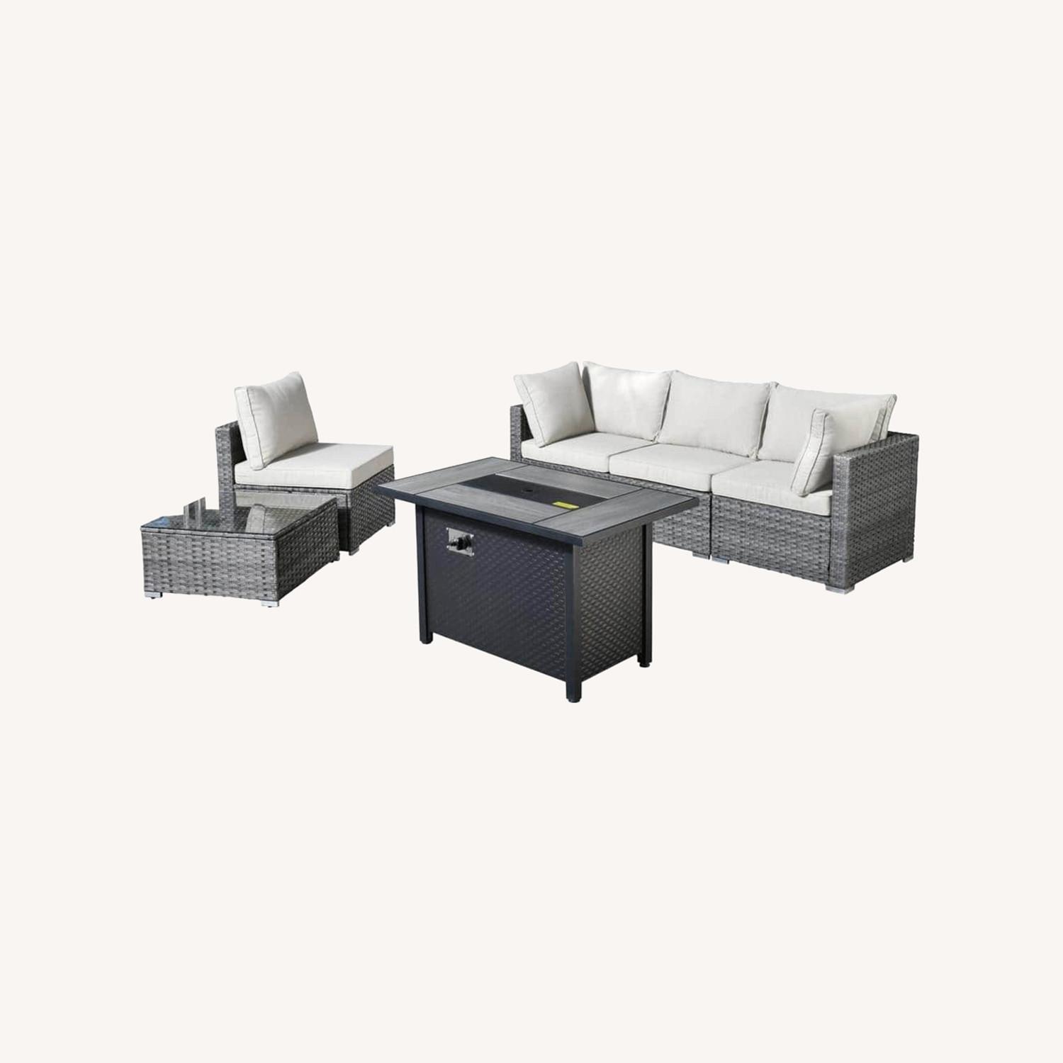 Seller's Notes:Looking to upgrade your outdoor space? Meet the Messi 6-Piece Wicker Outdoor Fire Pit Patio Conversation Sofa Set-the ultimate addition for any backyard retreat! This stylish set is built to last, featuring a rust-resistant powder-coated iron frame and hand-woven PE rattan that resists fading, UV rays, and water. Plus, the high-density foam cushions and resilient back pillows offer unmatched comfort. The outdoor-friendly polyester cushion covers are not only fade, UV, and water-resistant but also removable for easy hand washing-keeping your seating fresh season after season. When the sun sets, gather around the fire pit to create a warm, inviting ambiance without the hassle of smoke and ashes. The fire pit's rust-free frame ensures it stays strong and stable for years to come, while its chic dark copper and rattan-inspired finish adds a touch of retro elegance. What's more, the tile tabletop stays cool to the touch, offering safety and a perfect spot for drinks and snacks when covered. Don't miss out on transforming your outdoor space-this set is your ticket to luxurious relaxation and unforgettable gatherings!