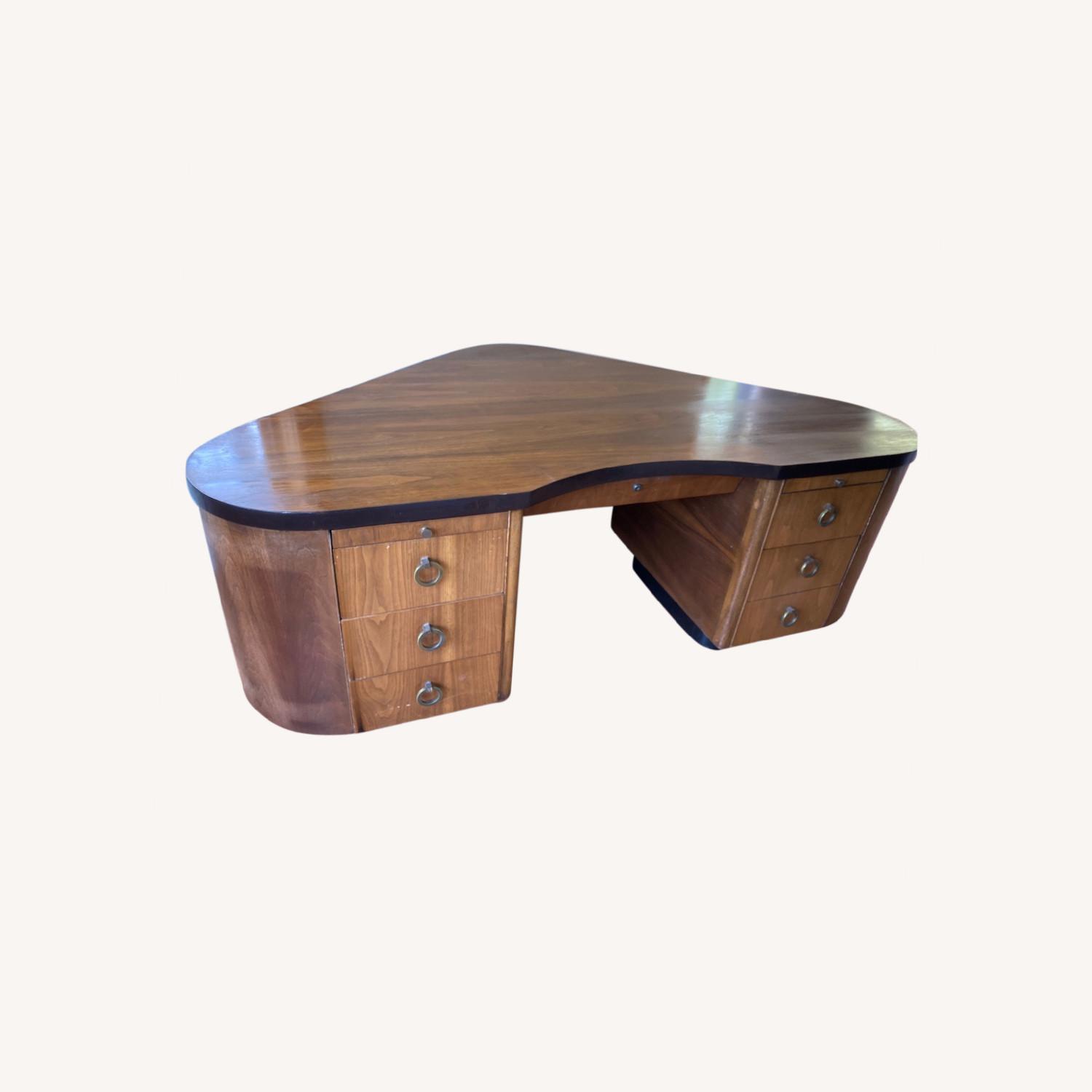 Seller's Notes:A dramatic mid-century modern piece designed by Frank Fletcher of Fletcher Aircraft, Pasadena. Delta-shaped, was used as Hollywood producer's desk in Coen Bros. film, Barton Fink. purchased in SF in 1984 and recently desktop and veneer were re-finished. Two sold recently on 1stdibs for $14,500 and $9,500 respectively. I love this desk but no longer have room. I will pay for shipping.