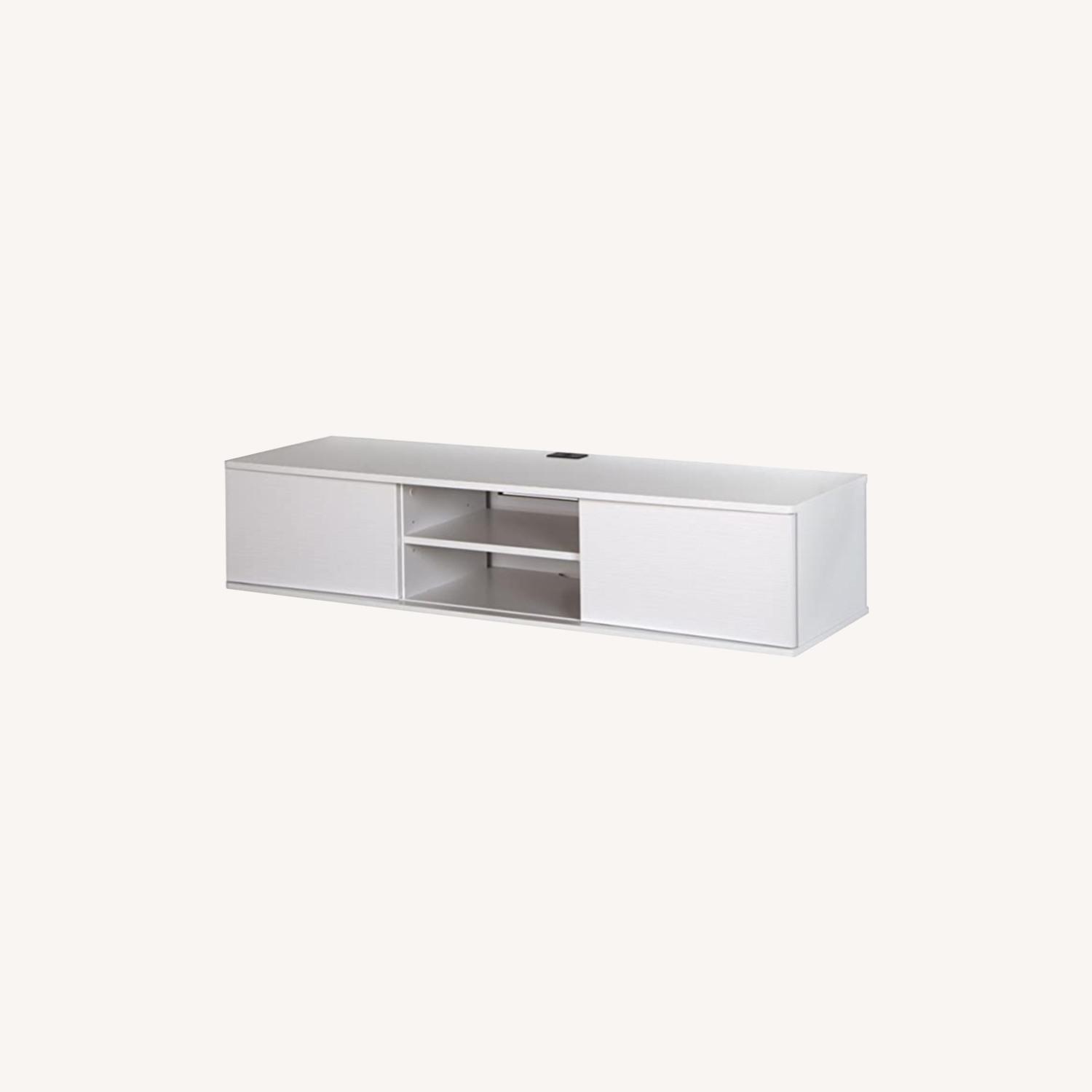 Seller's Notes:Used gently. Includes mounting hardware not attached to unit. Great minimal unit to keep larger TVs at eye level. Pictured with a 60" TV. The light, airy style makes this a compact media console with maximum storage space. This contemporary wall mounted piece helps you free up space so you can say goodbye to the clutter that Often happens in the TV area. 5-year limited all our products meets or exceeds North American safety standards and our packaging are tested and certified to reduce the risk of damage during shipment. This item is shipped in 1 box, make sure to have a friend with you. Assembly is required by 2 adults and tools are not included. If you have questions regarding this product or need assistance do not hesitate to Contact South Shore furniture 7 days support. This product is made in North America with laminated particleboard. Accessories not included. Console hangs on wall, so floor is less cluttered