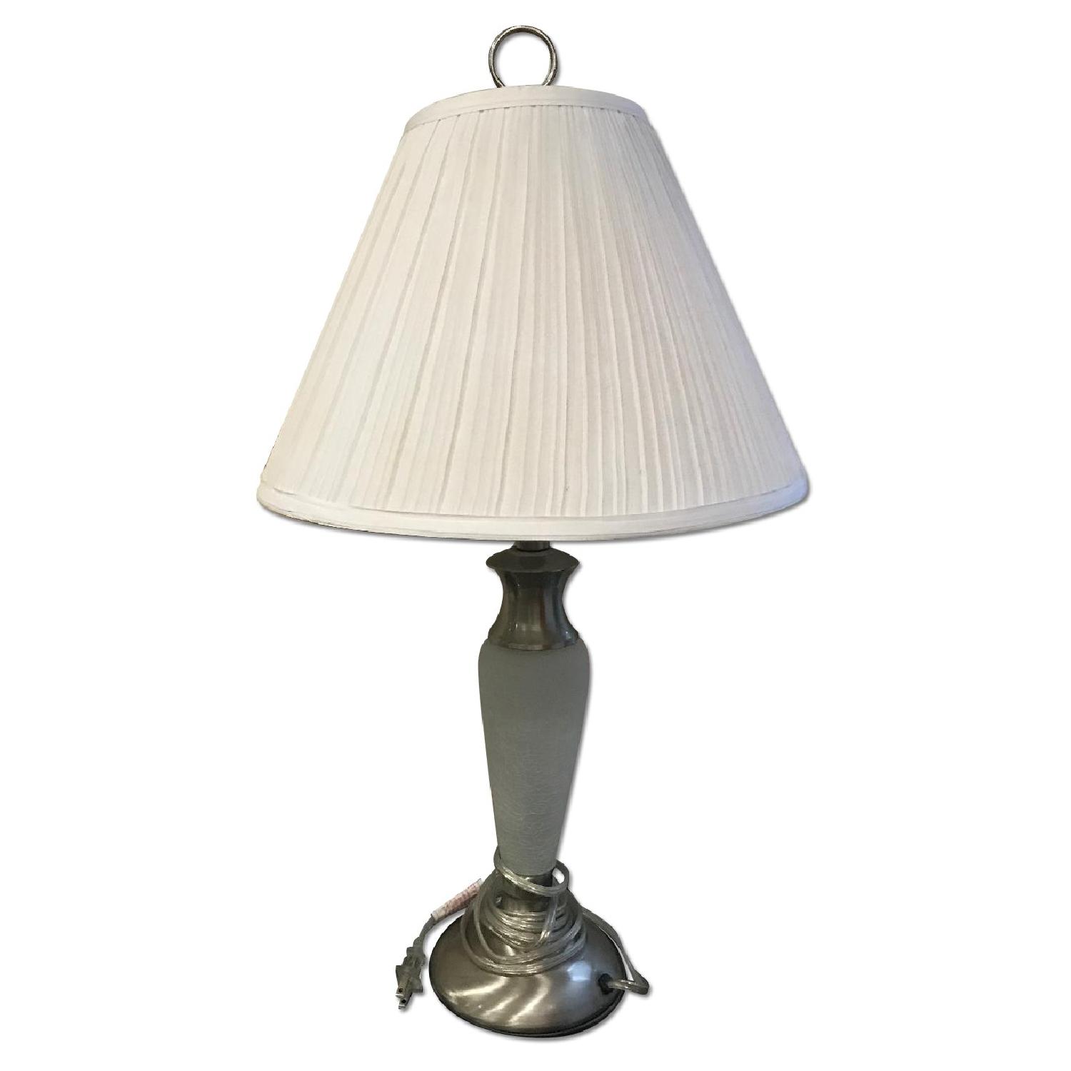 Seller's Notes:Set of 3 lamps, great condition, like new! 2 table lamps and 1 floor lamp. 3 piece table and floor lamp set with frosted glass columns and soft pleated white shades; Floor lamp dimensions - 17-Inch diameter, 66-Inch tall; Table lamp dimensions - 15-Inch diameter, 27-1/2-Inch tall ** No Signs of wear-- had to put something down