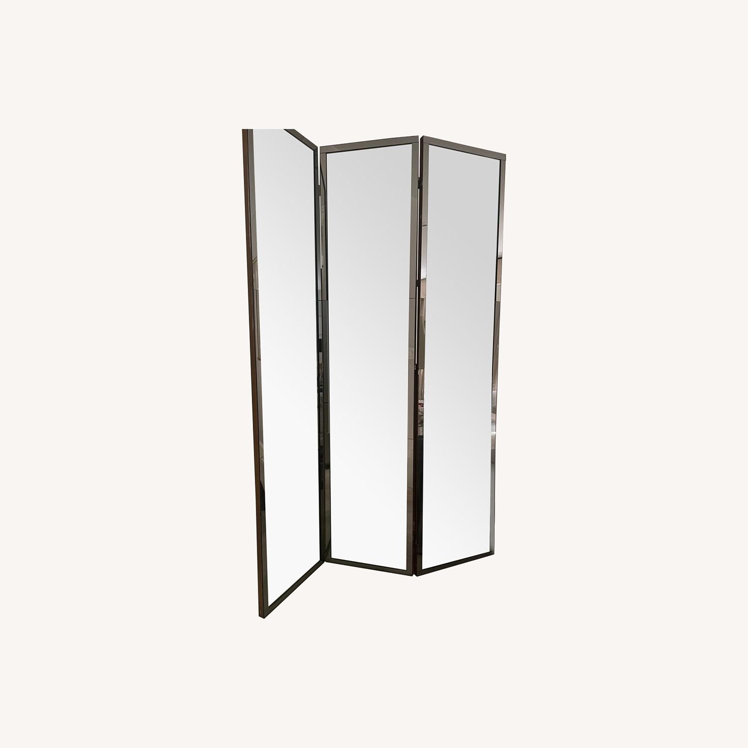 Seller's Notes:Make a bold and stylish statement with this sleek 3-panel folding floor mirror. Featuring full-length mirrored panels framed in a glossy black or dark bronze finish, this versatile piece enhances any room by adding depth, light, and elegance.