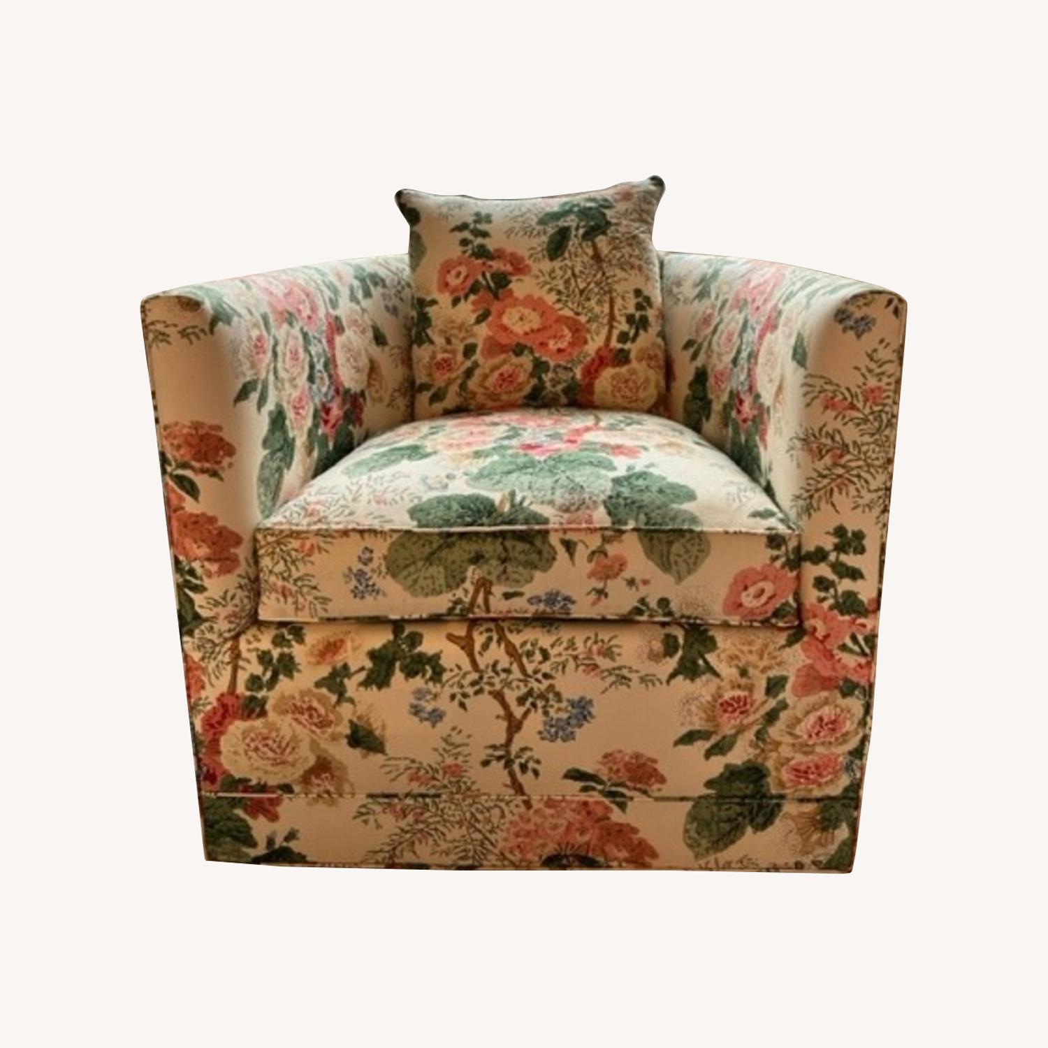 Seller's Notes:Floral Print Swivel Armchair. Turns 360 degrees. Used - like new. Covered in Lee Joffa Hollyhock Fabric.