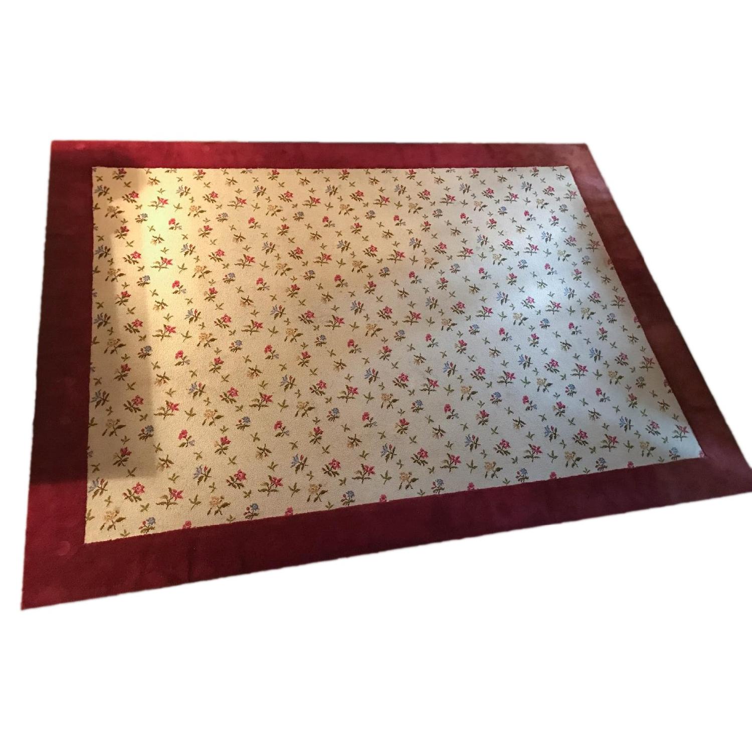 Seller's Notes:White/Multi floral wool hook rug Maroon border Rectangle that measures 9x12 feet Slight wear (pictured) but in very good condition