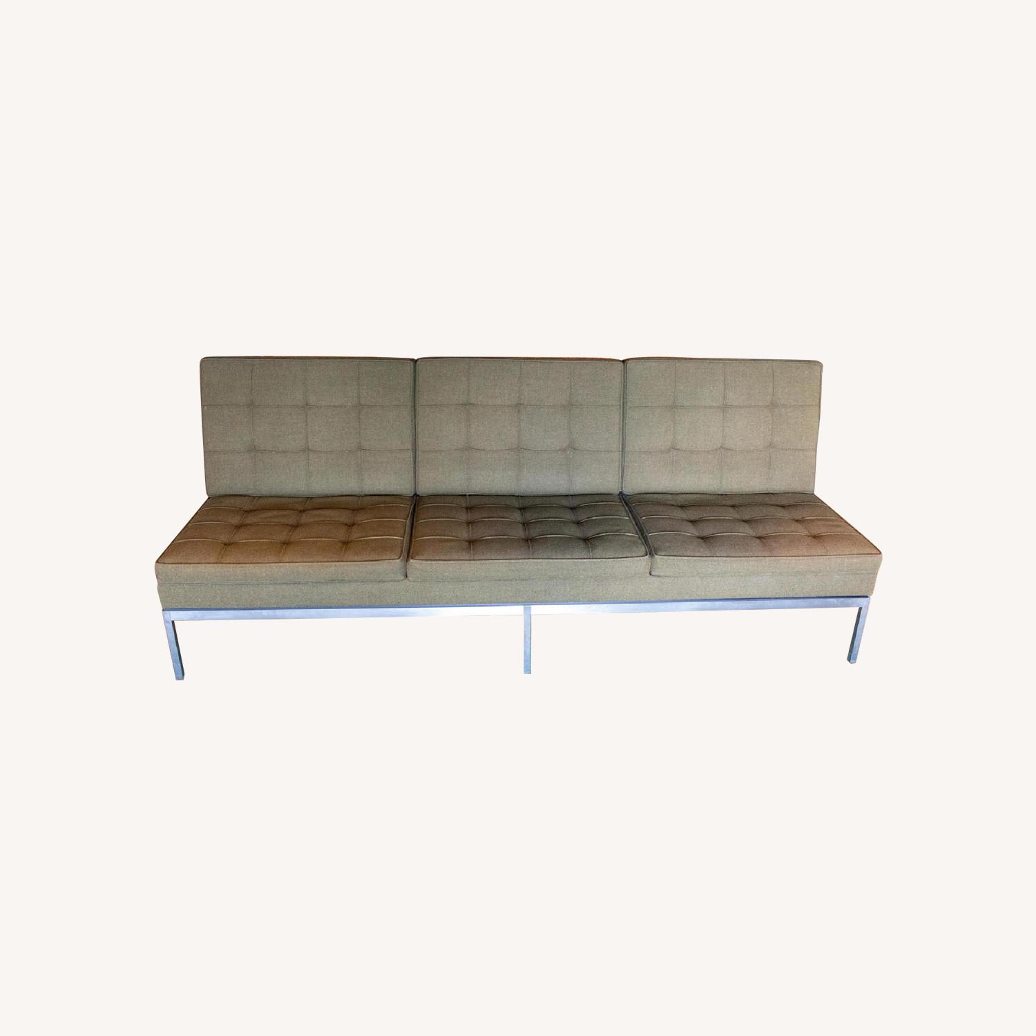 Seller's Notes:Vintage mint condition olive green Florence Knoll armless three-seater loveseat from the 1960's. Authentic mid-century. Newly upholstered it 2018. Used minimally. Armless sofas on chrome frames. Box stitching and welting on seat cushion and backrest. Dimensions: 84.5" x 25" x 32". Condition: Excellent, newly reupholstered.