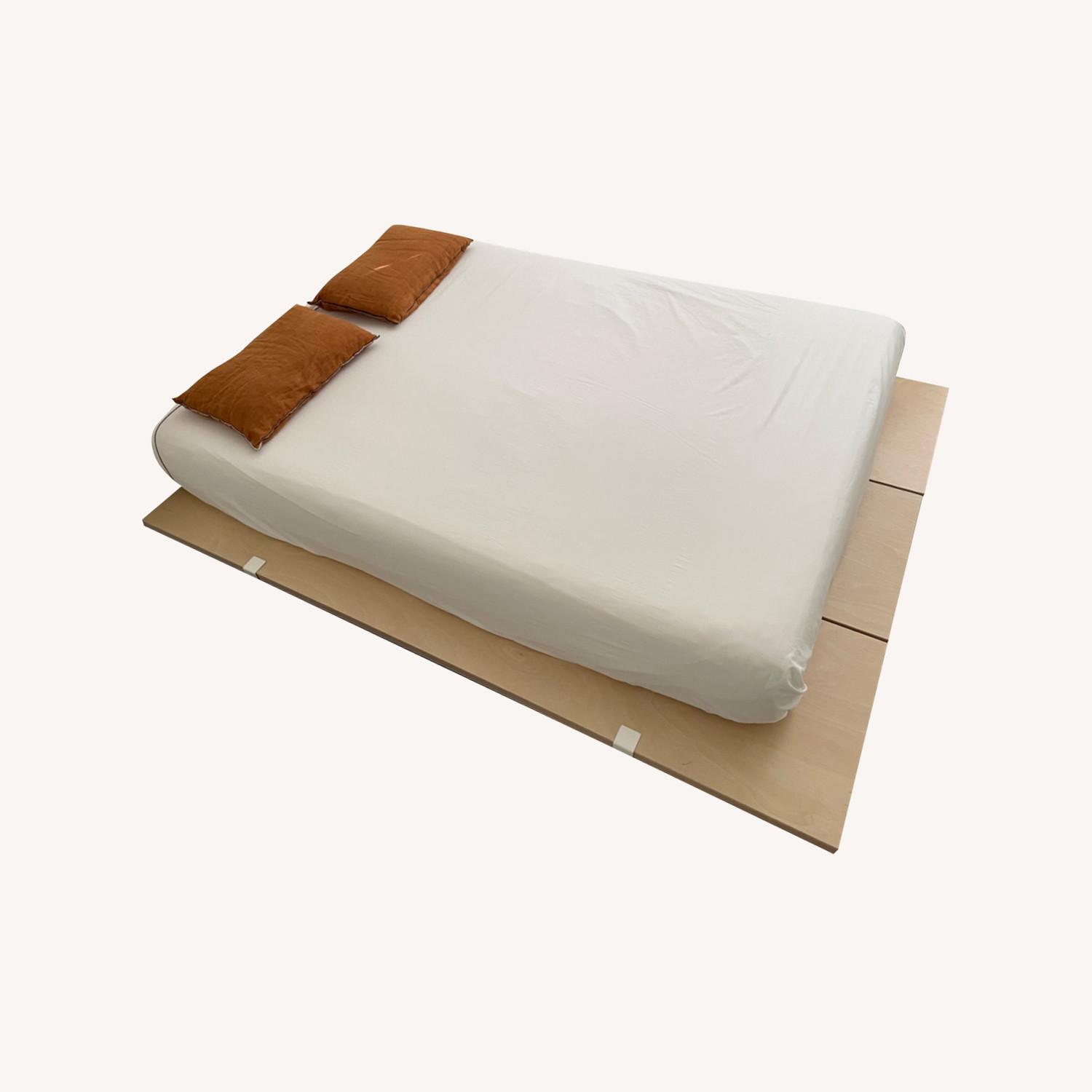 Seller's Notes:Floyd Queen size Platform Wood bed frame in very good condition. Real wood veneer and birch plywood with an engineered lightweight core that is manufactured in the US. Includes: (3) 22" wooden panels, 8 clips, and 2 straps. Complete Dimensions: 67" wide × 86" long x 1.5" thick. 7.5" off the ground.
