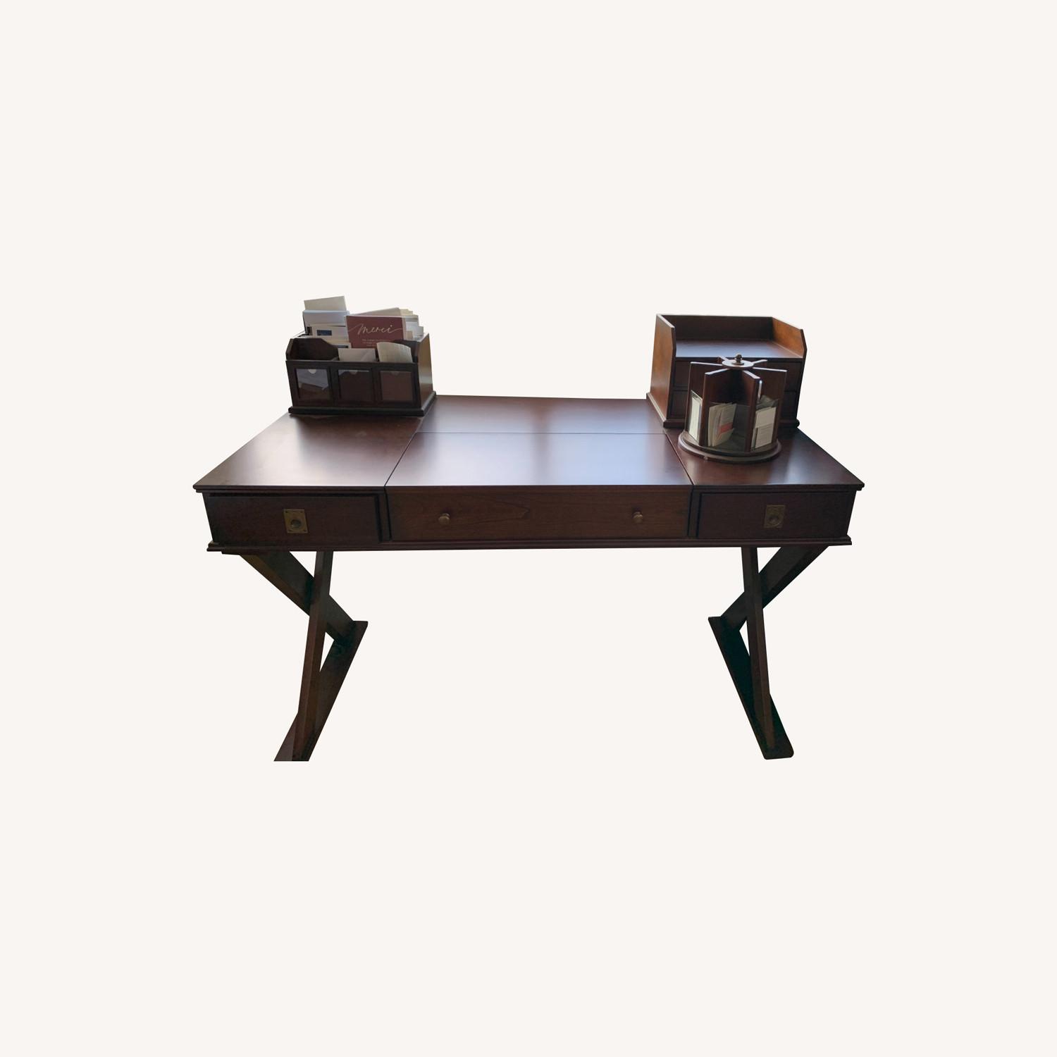 Seller's Notes:Walnut desk with up leaf, ideal to work from computer With mail and paper storage wooden accesdories
