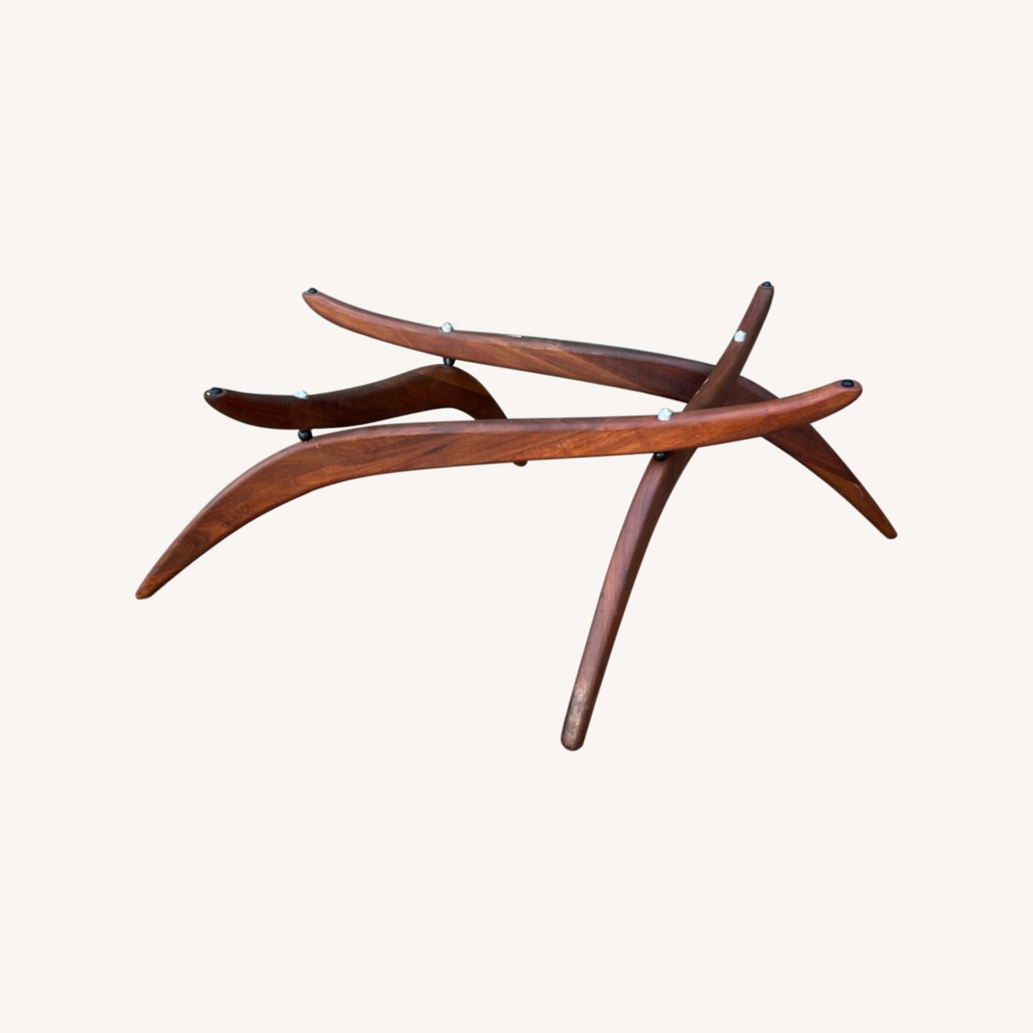 Seller's Notes:Sculptural coffee table base designed by Forest Wilson. The table consists of four walnut legs with black plastic ball dividers with aluminum caps. The measurements of the base are approximately 25” wide by 36” long by 14 1/2” high. One plastic ball is split, there are two deep scratches on one leg and normal wear throughout the piece.
