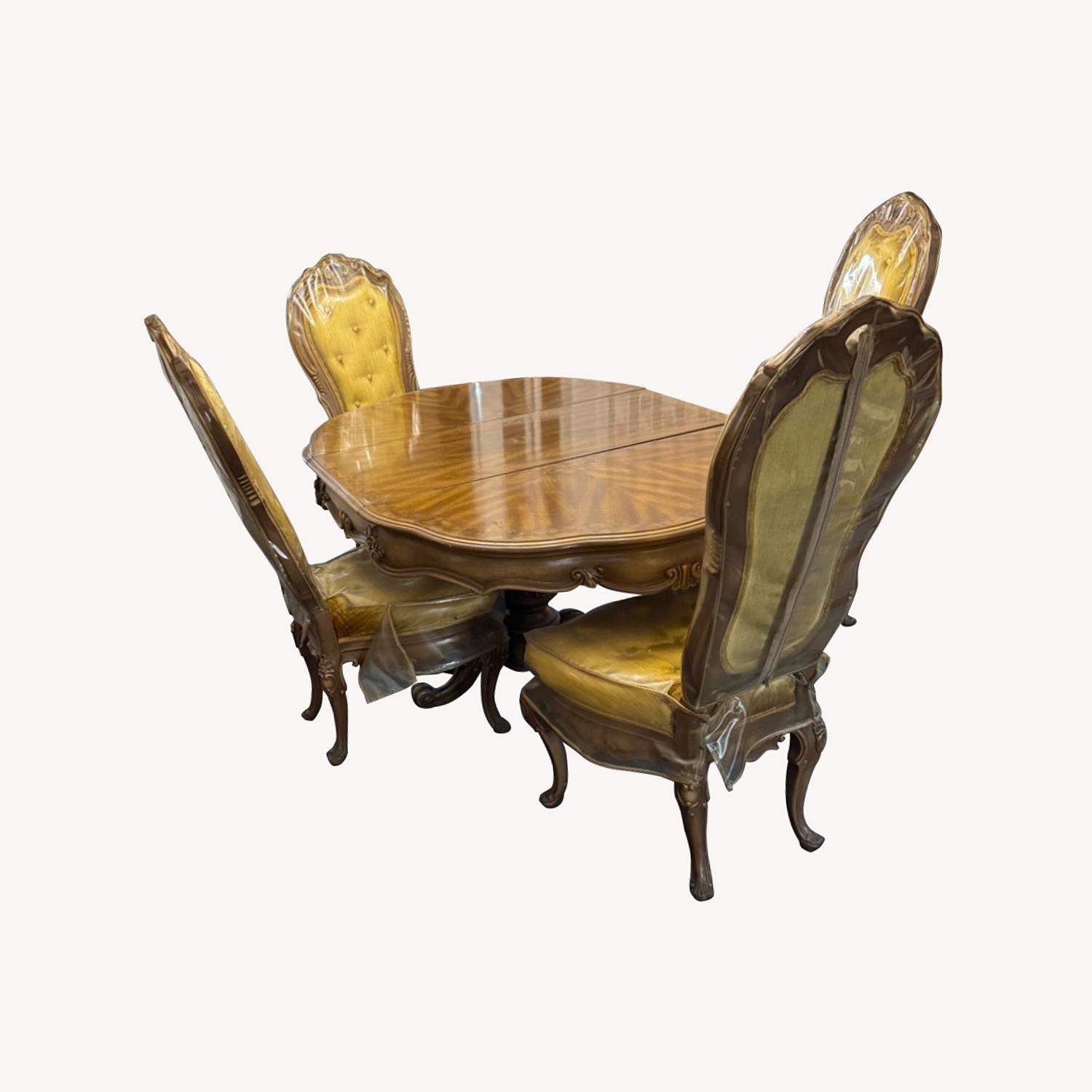 Seller's Notes:Luxurious dining room set. 42” round with 2 18” leaves. 76” tall. Has 4 chairs and 2 arm chairs