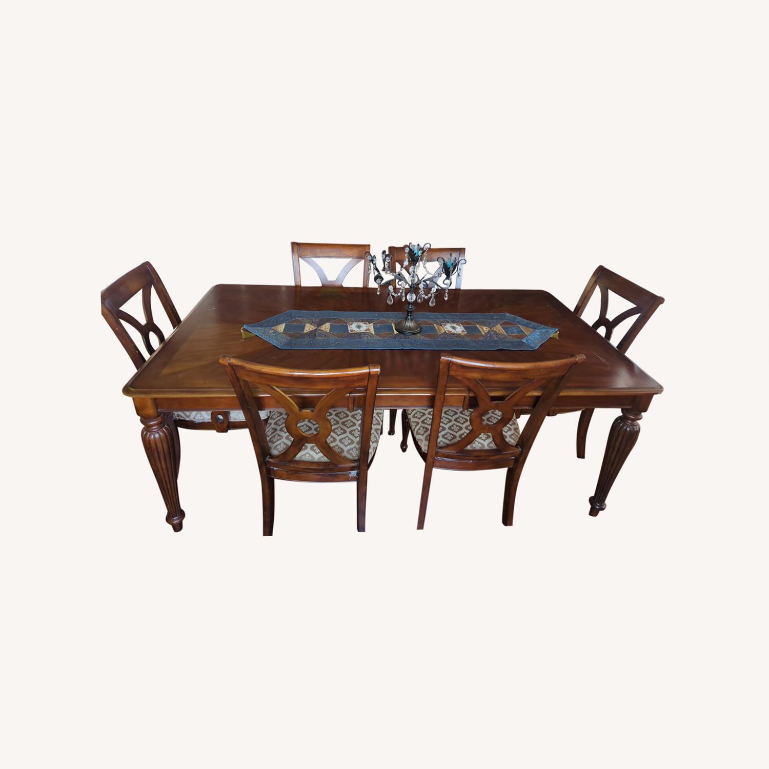 Seller's Notes:This is a formal dining table and 6 chairs. The dining table has a detachable middle price to lengthen the table