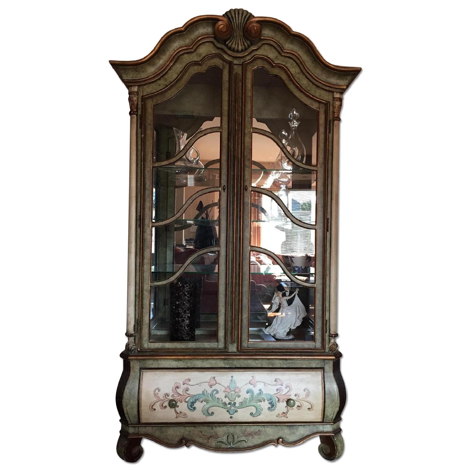 Seller's Notes:This bueatiful curio was purchased from fortunoffs and has been with us for 8yrs. It's in good condition with a few minor nicks. It has 3 glass shelves for display and a mirror back and light. Bueatiful hand painted design with a distressed paint color.
