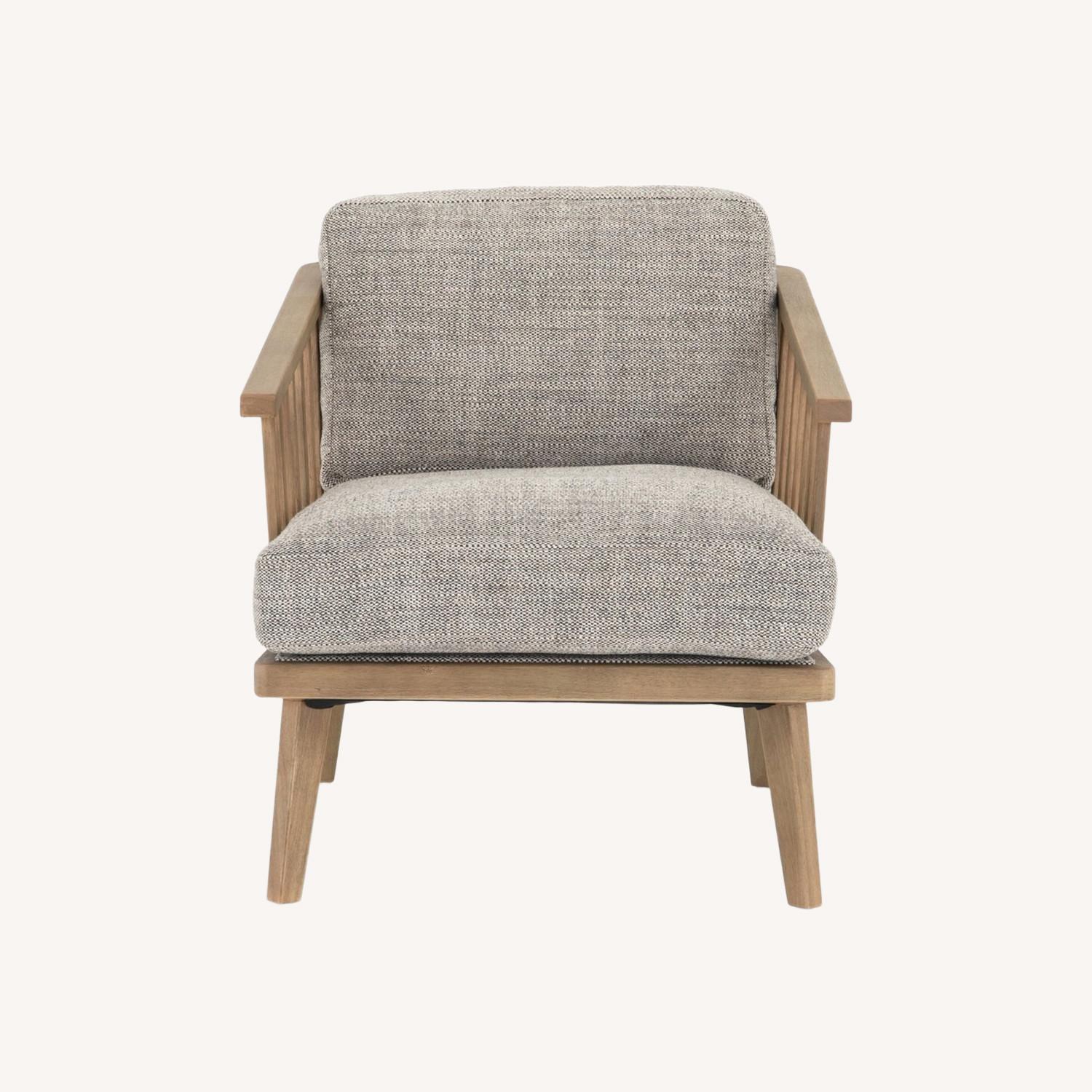 Spindle detailing for an airy look, with angular wooden arms and cleverly positioned legs, plus feather-blend cushioning covered in a textural performance-grade upholstery exclusive to Four Hands.
