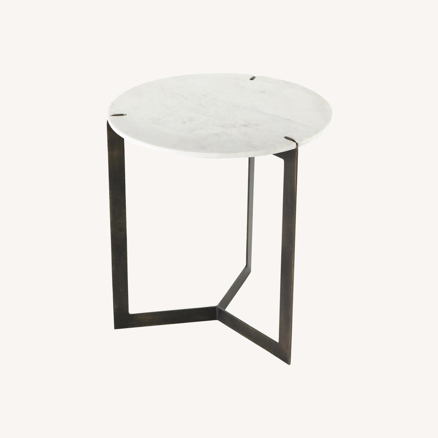 Seller's Notes:Beautifully grained genuine marble side/end table by Four Hands. 5 years old. The legs are thick metal and supposed to be a little rustic. Some of the darker sheen on the legs have come off from natural usage, with a muted golden/bronze underneath. Marble is in good condition, no scratches or stains. The marble top is placed on top of the legs, so it comes off by lifting. When the marble top is on, the table is firm, not wobbly. The marble is heavy. That said, if you forcefully push down one edge of the top with your hands, it will lift/tilt (but not from placing regular items like books or mugs). The table is tall and the surface top is large for an end table, so it works well next to a couch.