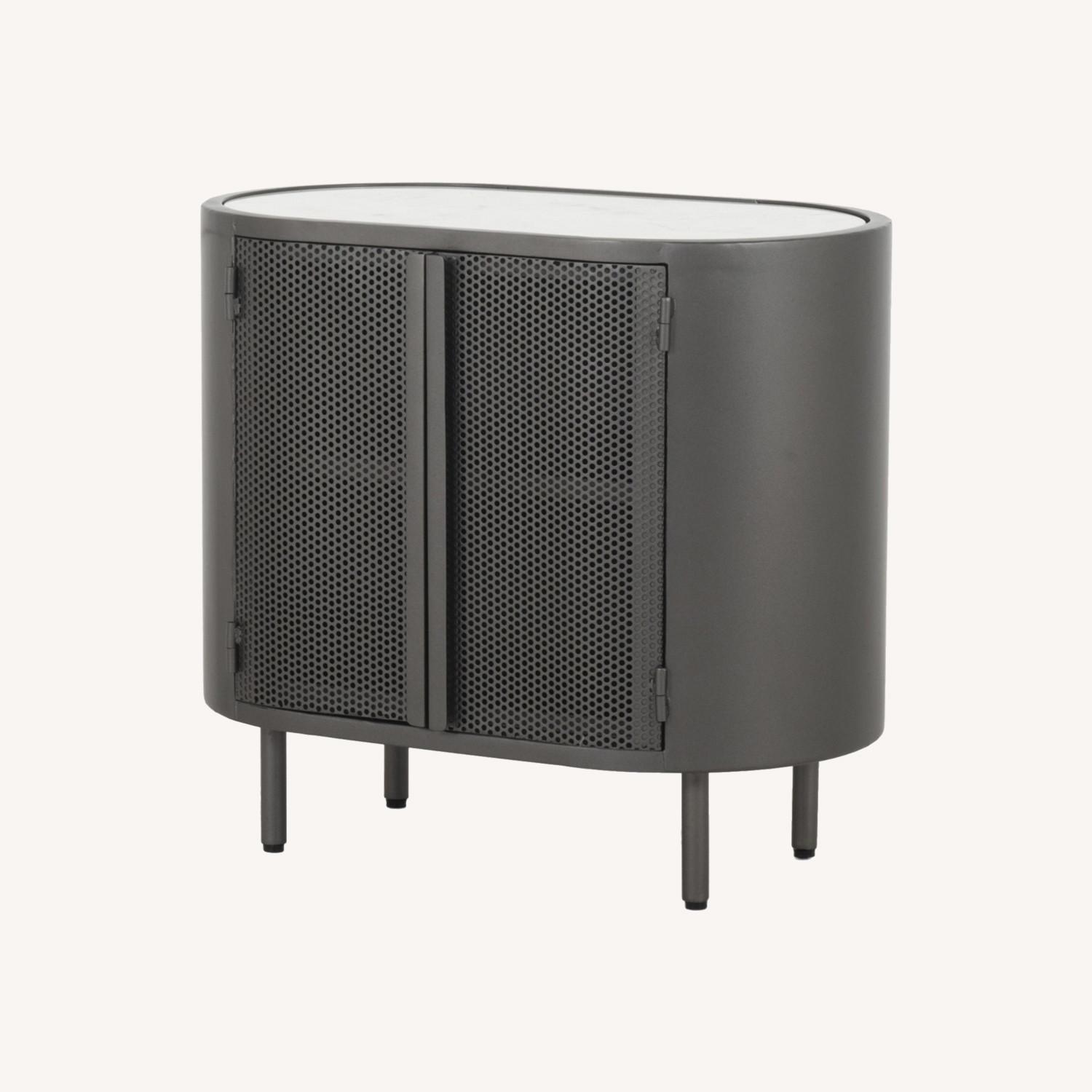 Seller's Notes:NEW. Out of the box but NEVER USED. Gunmetal-finished iron. Rounded pill-shaped. Perforated metal with a polished white marble top. Interior shelving plus rear cutout for cord management.