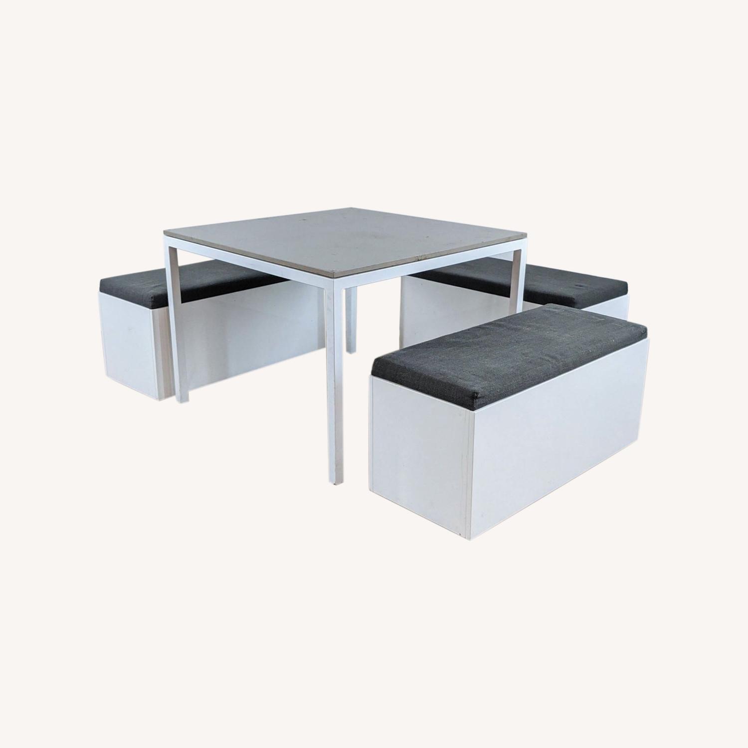 Seller's Notes:Description: This four-piece dining set features a square Stone top table with metal legs and three benches with seats that open up for storage. Bench dimensions:38” x 16” x 19”. Brand: CB2. Gently used - any blemishes or damage will be included in the photos. #SKU: 1054694. Tags: metal,faux marble/stone