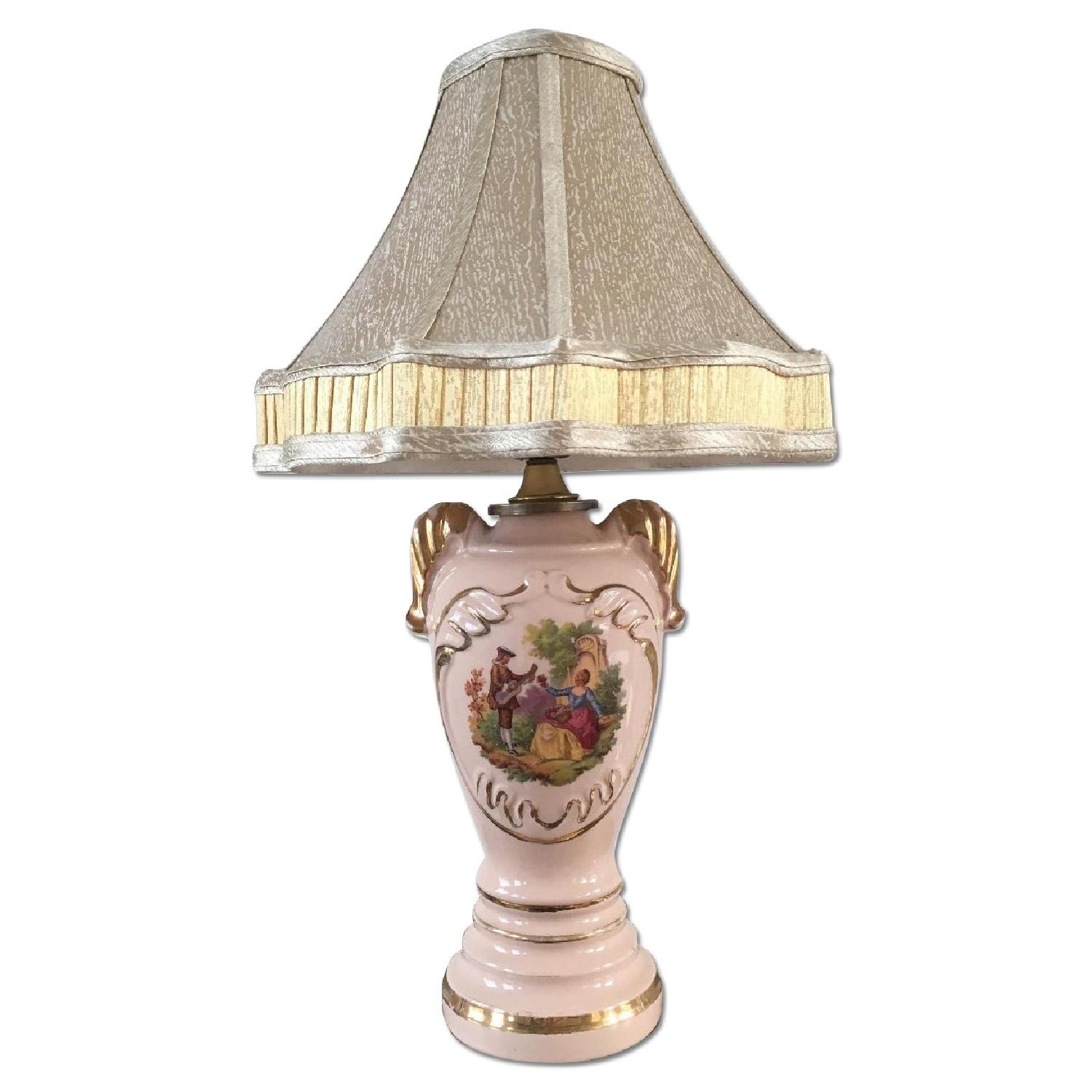 Seller's Notes:I love this antique urn lamp but I moved in with my boyfriend and we no longer have room for it. The piece is a blush, Fragonard inspired urn lamp complete with a whimsical courting scene. I purchased the lamp 3 years ago from a local NYC antique store, but do not know how old it is. I had the beautiful textured gold lamp shade made specifically for the lamp. Some of the gold detailing on the lamp base has faded and there is a few small scratches in the paint, but these irregularities are part of the charm of antiques! It is in the exact same condition in which I purchased. I also had it re-wired with a new gold cord. (measurements include the lamp shade)