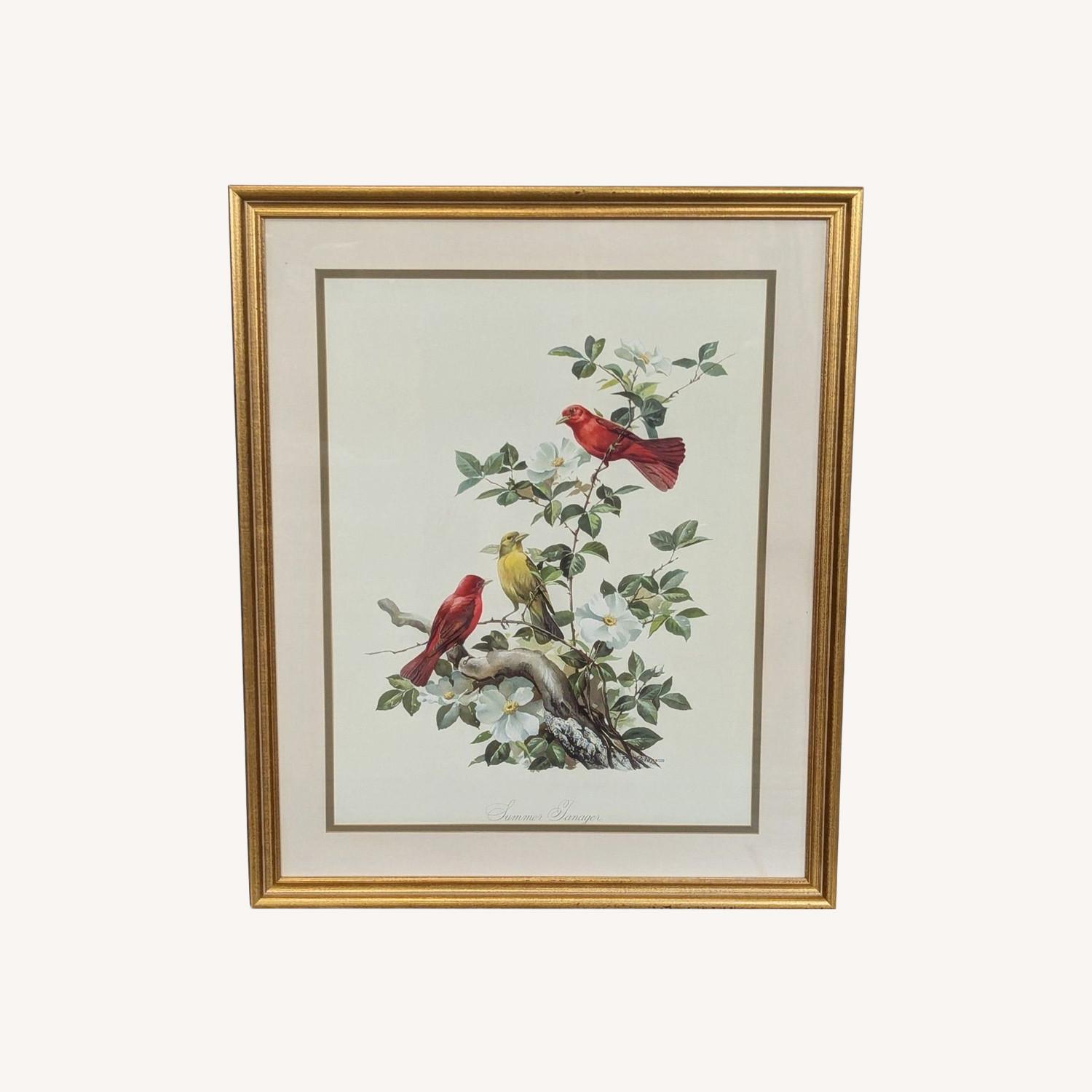 Seller's Notes:This is a framed art print titled "Summer Tanager" by Roger Tory Peterson. The print depicts two male and one female summer tanager birds on a branch with white flowers.