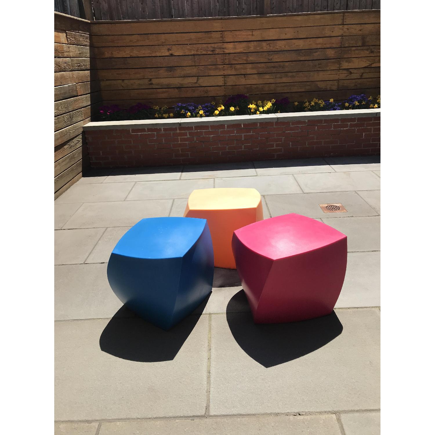 Seller's Notes:3 cubes: 1 blue, 1 yellow, 1 magenta As he tells the story, Alan Heller presented an idea to architect Frank Gehry, who is known for his twisting, unconventionally shaped buildings. “We can take your architecture and turn it into furniture,” Heller said. “No one has ever done that before.” The architect loved the idea, and the Frank Gehry Left Twist Cube (2004) was born. Heller produced it in a “Gehry bouquet” of colors inspired by the architect’s flower sculpture for French artist Sophie Calle. The colors had the unexpected effect, Gehry says, of inspiring his firm to “put more color into our architecture.” The cube can be used as a stool, bedside table, end table, shower bench, ottoman or coffee table, adding a bit of playful Gehry architecture to just about any room in the house. Made of rotational-molded polyethylene, the cube is extremely resistant to breakage and weatherproof. Suitable for residential or commercial use indoors and out. Made in U.S.A.