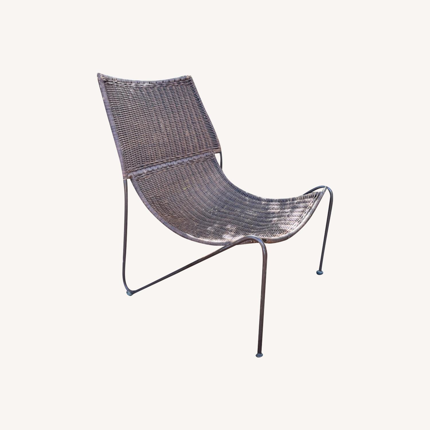 Seller's Notes:A pair of mid century modern lounge chairs designed by Frederick Weinberg. Wicker seats and backs with wrought iron frames. Made in the USA, 1955. These chairs have a solid iron steel frame, black painted and the seats are made of woven wicker. The chairs are in good original condition with wear to the the cane, but very good for the age.