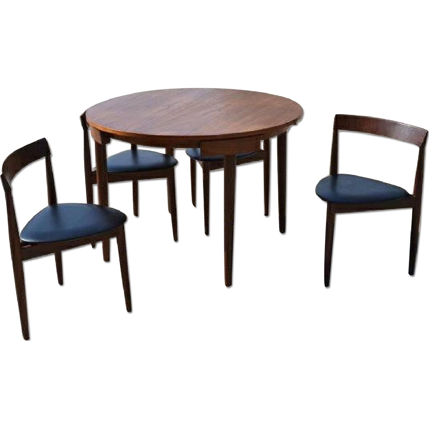 Seller's Notes:Described as "possibly the most unique and well designed dining set to ever come out of Denmark" - Hans Olsen's iconic set for Frem Rojle has gained tremendous admiration throughout the world because of its space saving design. Shows excellent form and function. When in place, the 4 three-legged chairs integrate perfectly with the skirt of the table forming one unit making it a great solution for smaller living spaces. This set has one reproduction chair; and we have 3 original chairs. The triangular chairs along with the table legs and skirt, are all made entirely out of solid Burmese teak, with gorgeous grain patterns throughout. This set is in very good condition. Open to offers. DIMENSIONS (measurements): Table: 42" x 29" h Chairs: 19.5"w 17"d x 28"