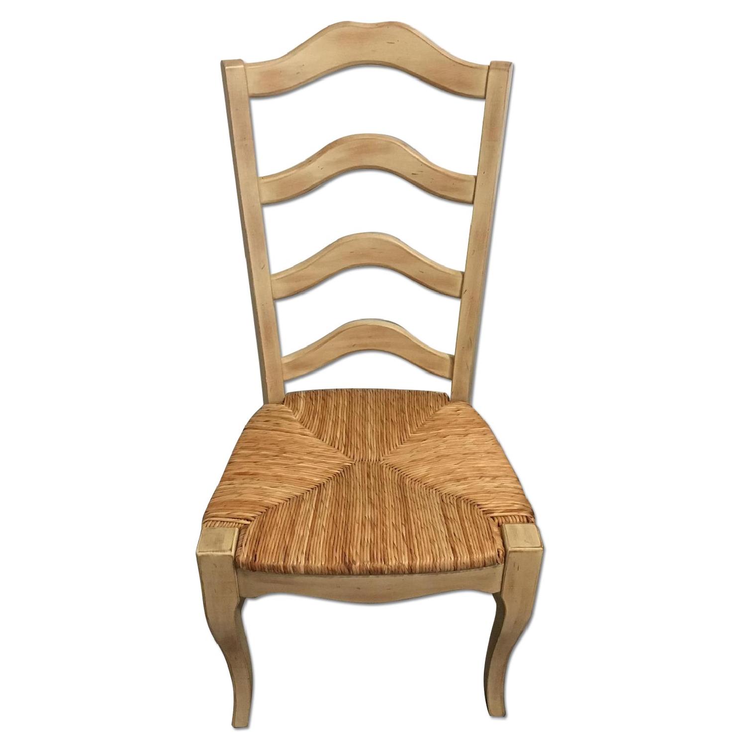Seller's Notes:Charming set of 4 dining chairs from Freemarc. Natural/beige lightly distressed wood with wicker seat. Optional seat pads included. Excellent condition and great quality. Very similar (though not identical) to link in profile. Seat height 18 inches. Seat width tapers slightly (20.5 inches in front, 16 inches in back).