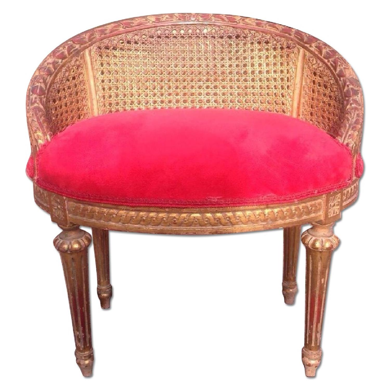 Seller's Notes:This is a beautiful very old French Vanity chair. It is supposed to be used in front of a make-up table or a vanity, but would look beautiful for other purposes too. It was made in France, somewhere between 1860-1880, in the Louis XVI style. It has recently been refurnished in a beautiful red French deep velvet colour. Its measurements are: 24 inches wide x 25 inches high (ground to top) x 15 inches deep x 19 inches high (ground to sitting) The gilding work is authentic, has not been restored. We like to keep the item as authentically beautiful and old looking as possible, because we believe that adds to the luxurious feeling that people get from this chair. It is in a very good condition when you take its age into consideration. This is a beautiful authentic piece, yet also very sturdy. It has been beautifully hand carved and decorated with flowery motives and branches that flow from the Louis XVI style that it was crafted in perfectly.