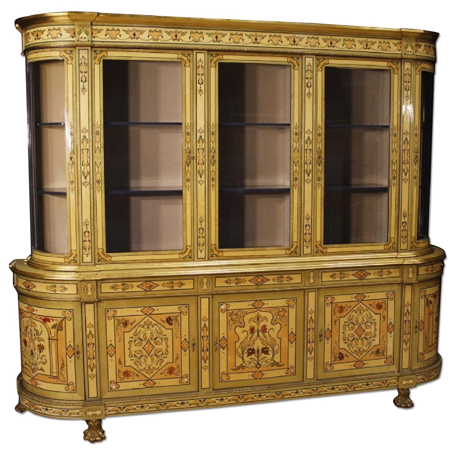 Seller's Notes:COD: 7626 Great French bookcase of the second half of the 20th century. Exceptional quality and decoration furniture inlaid in various woods. Display cabinet adorned with gilded and chiselled bronzes, brass and zoomorphic feet. Four feet in gilded and chiseled bronze. Double body sideboard complete with two working keys and internal shelves. Salon bookcase of fabulous service with 5 doors and 5 drawers in the lower body. Upper body with 5 doors with recessed glass. In good condition with some signs of wear.