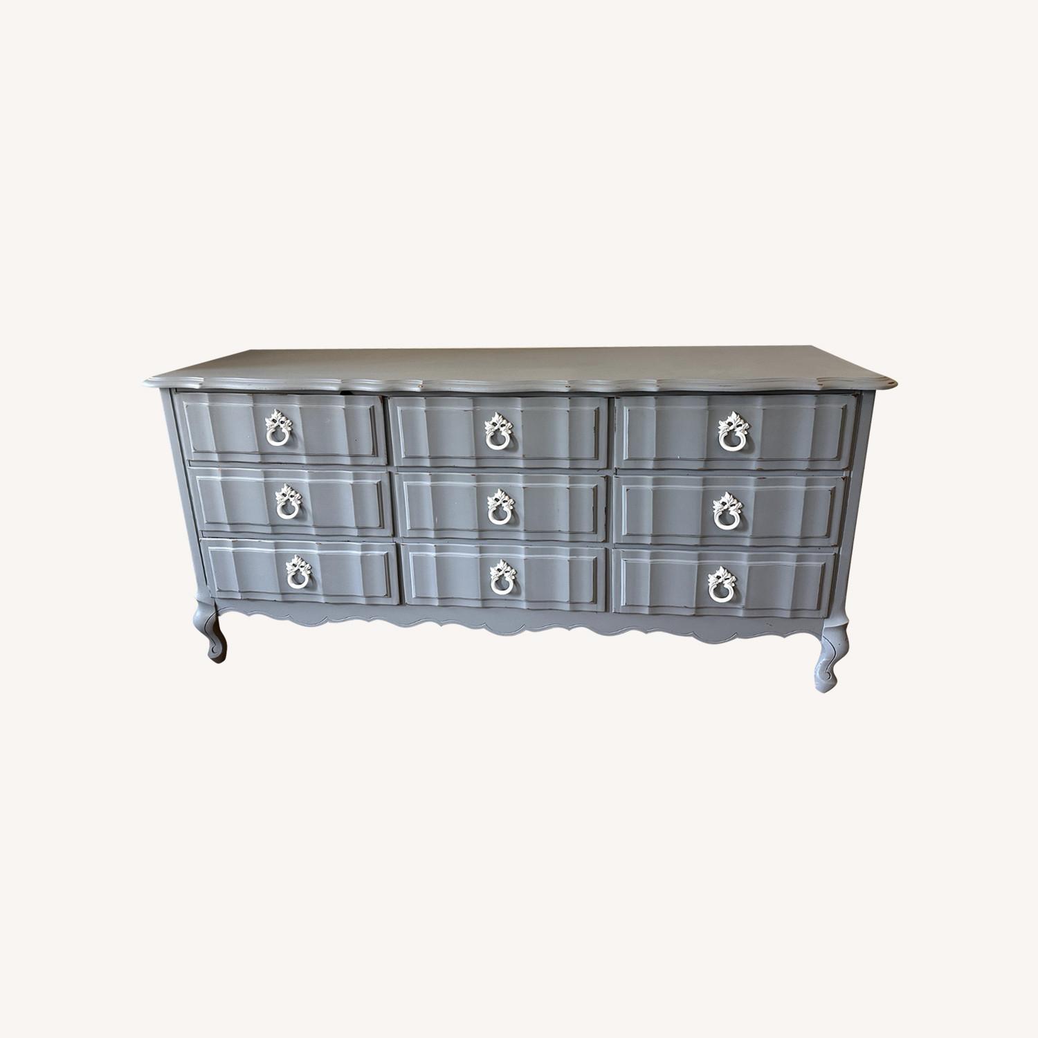 Seller's Notes:Antique French country dresser in great condition! Some minor scratches inside a drawer and light stains on top (hardly noticeable). Custom painted gray with distressing and white handles. Drawers are all the same size: 17.75" x 14.75" x 5.5". It fits a lot of stuff!
