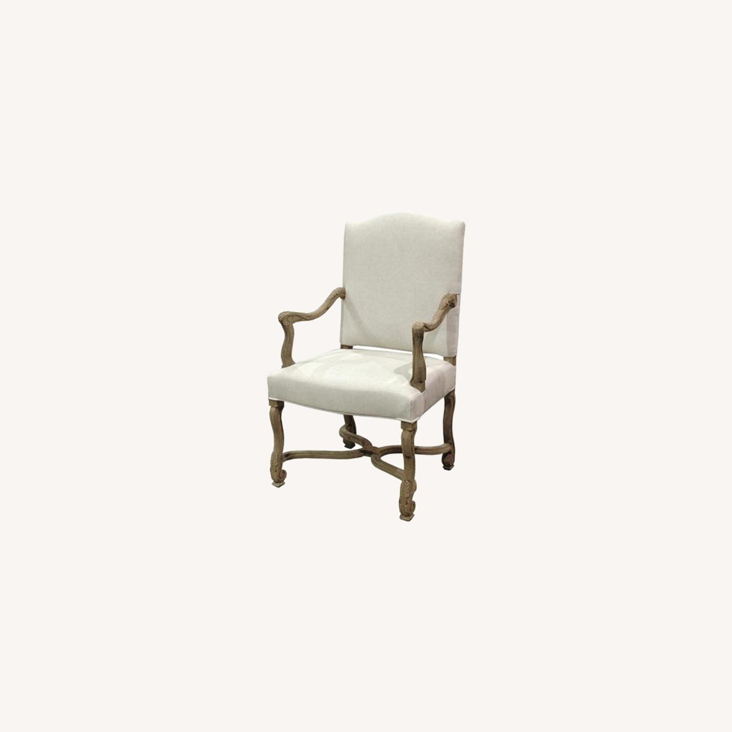 Seller's Notes:This chair has never been used. I bought it, but it didn't work in my space, and I am unable to return it. It is a beautiful chair. One of the things we love most about French Country style is the combining of formal and informal elements. This charming chair embodies this approach perfectly with formal carved details on natural finished wood and a light linen upholstered body. SPECIFICATIONS 44 inches high x 26 inches wide x 24 inches deep Arm height at front: 28.5 inches; arm height at back: 31 inches; seat height: 19.5 inches Chair constructed from solid carved elm wood Carved acanthus leaf details on arm and front legs Light linen upholstery on foam seat