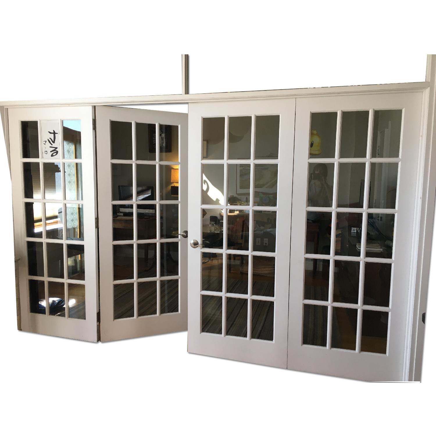 Seller's Notes:Indoor use French doors. 4 panels each measures 32in X 79in. Covering 128in with all together. Can be used separately. Wood frame with 15-True divided lites create a classic look, allowing natural light while offering privacy. 1 small screw hole at top corner of each panel.