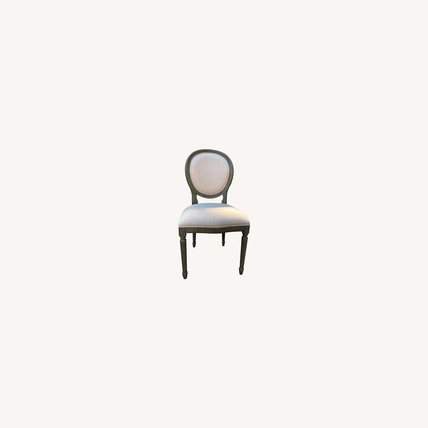 Seller's Notes:Set of six gorgeous, Modern French Provincial dining chairs. Each chair is upholstered in an off white fabric with a gray (greenish-gray) stain on the frame. Can be purchased in pairs at $450 per pair. This set is barely used, almost new, in superb condition.