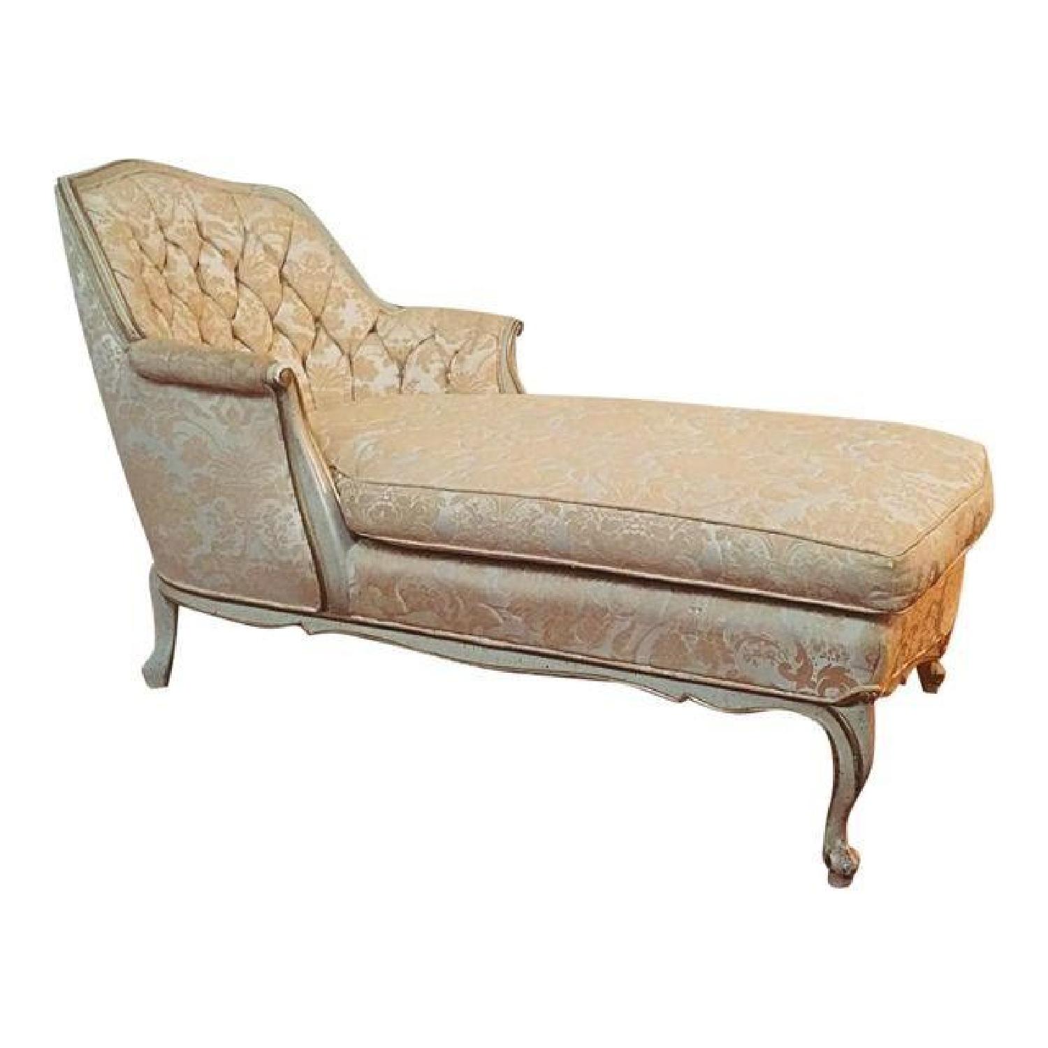 Seller's Notes:Beautiful French Provincial chaise lounge in creams and gold with a tufted back area. Damask floral design, excellent condition, and very comfortable. Solid wood legs featuring gold edging. Highly detailed and charming piece. Two very small areas of blemish (as photos show - very unnoticable). Functional and perfect for any room!