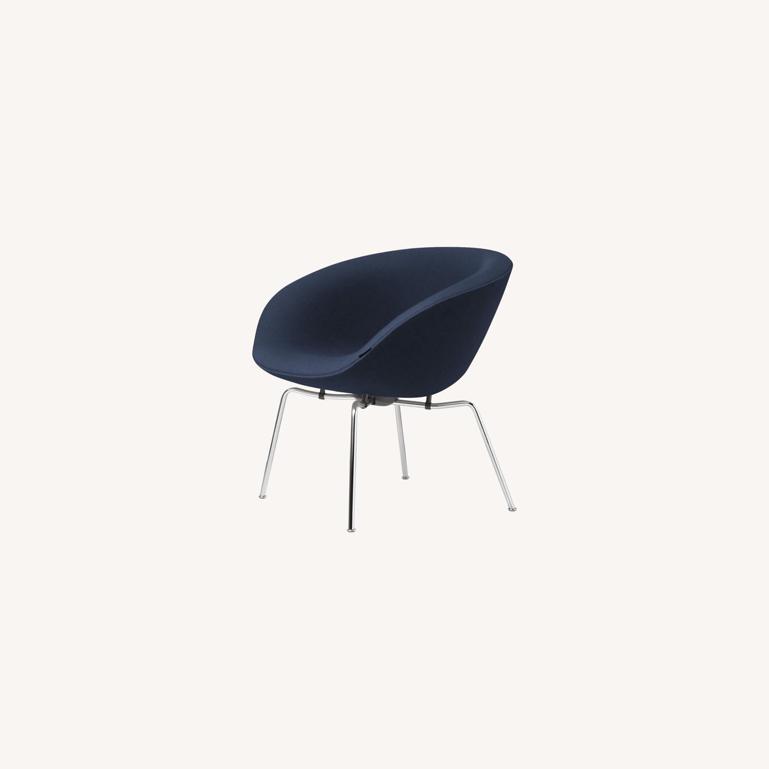 Seller's Notes:Arne Jacobsen created his Pot Chair (1959) for the SAS Royal Hotel in Copenhagen. Years later, it was relaunched as a fresh take on the original, revitalized for the modern interior. Retaining the striking shape of its predecessor, this modern rendition meets today’s demands through improved comfort and quality. Made in Denmark. Materials: Molded polyurethane foam shell Chromed tubular steel legs Fabric upholstery Plastic floor glides