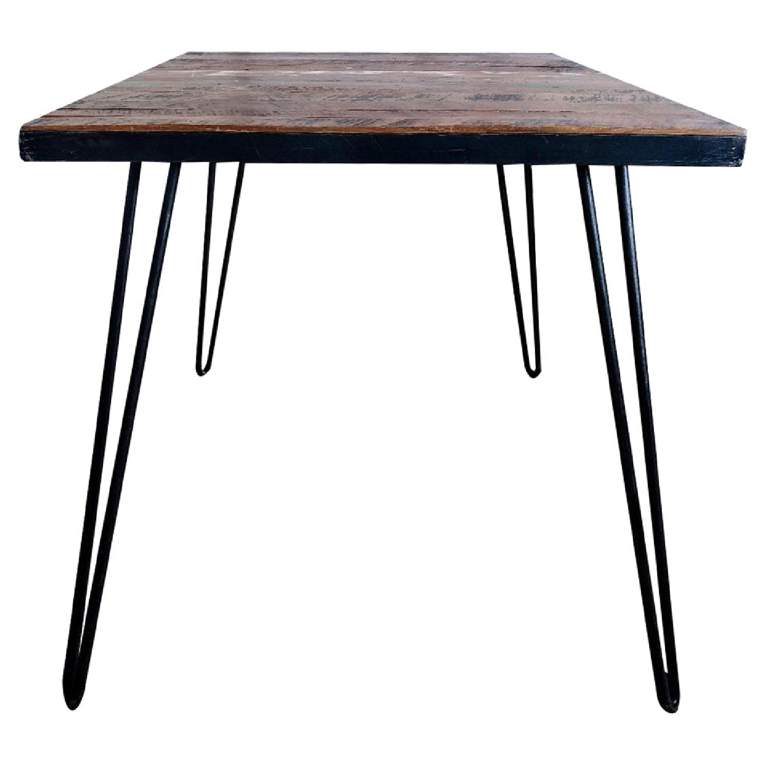Seller's Notes:Reclaimed teak wood dinning table with painted wood and black hairpin legs. Very solid and unique. It's perfect for small apartments! Purchased "from the source" - a boutique sustainable furniture company in Brooklyn. This was a custom size so it could fit in our small kitchen, but a similar listing here: Can seat up to 4 people comfortably. Just one year old - we love it and it's been great for our small Brookyln apartment, but we've moved and need something bigger.