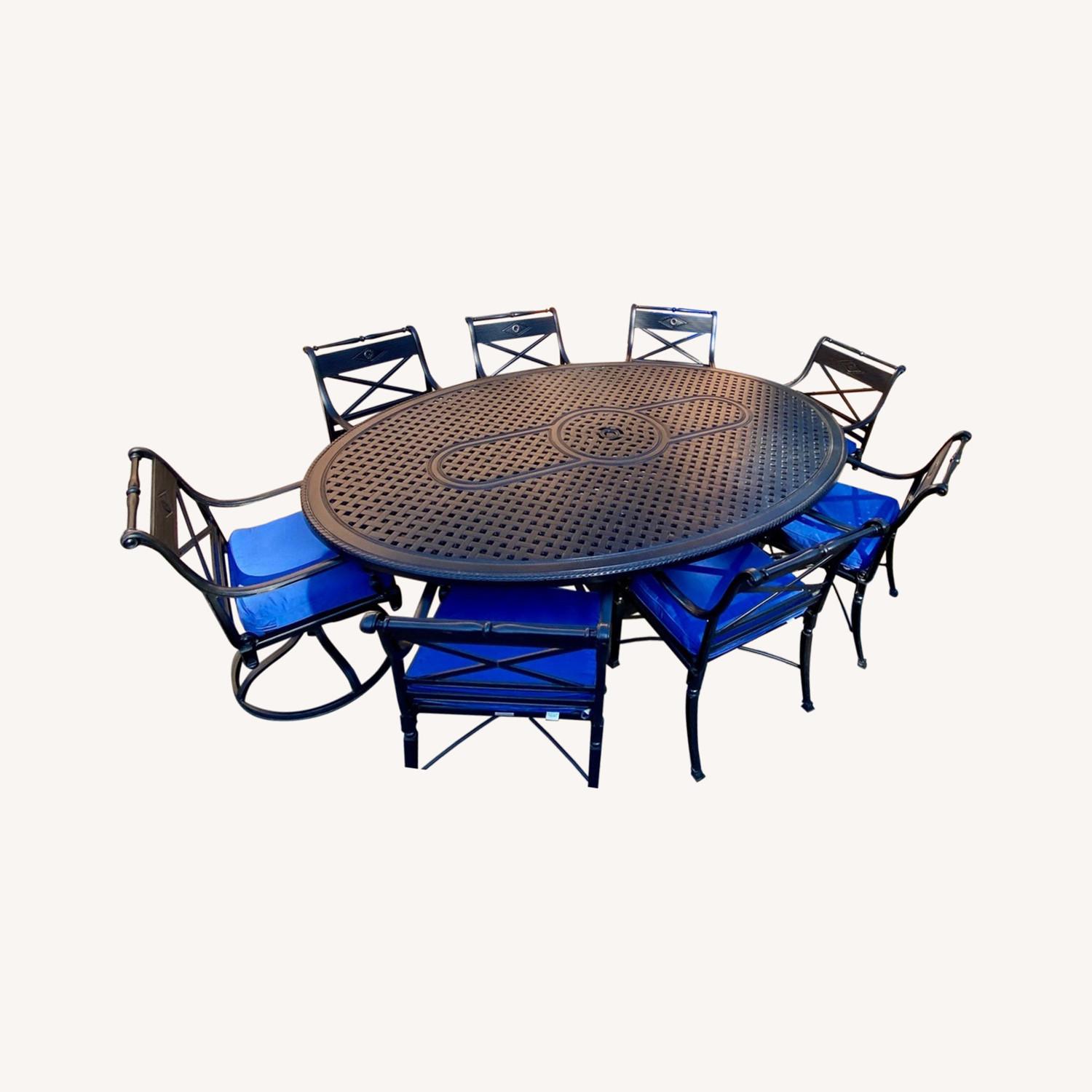 Seller's Notes:Selling a beautiful Frontgate Onyx outdoor dining table and 8 lounge chairs with custom Cobalt cushions. Onyx Aluminum material with UV protection, with waterproof, weather-resistent Sunbrella fabric cushions. Like new, very little use with little to no signs of any wear and tear. A handsome addition to any backyard set up, and perfect for entertaining groups for outdoor summer fun. Matching Side table, and 3-piece sofa set also for sale. Bulk discount available if you purchase the whole set- contact me for more details.