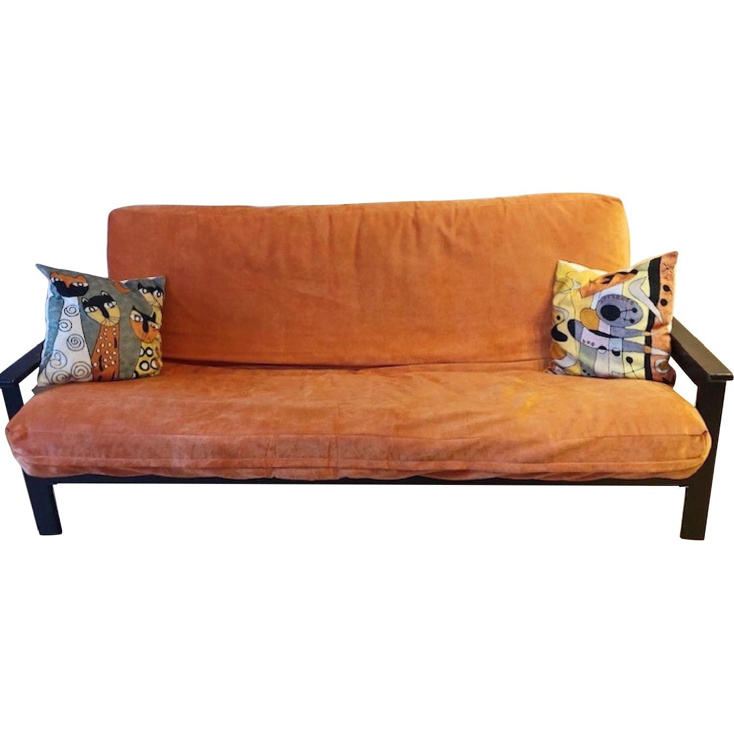 Seller's Notes:Full Size Futon sofa with dark wood frame and 2 pillows (hand-made in India). Very good condition, just a few minor scratches on the frame. Comfortable to seat or to sleep. The cover comes off the cushion, so can be easily cleaned.