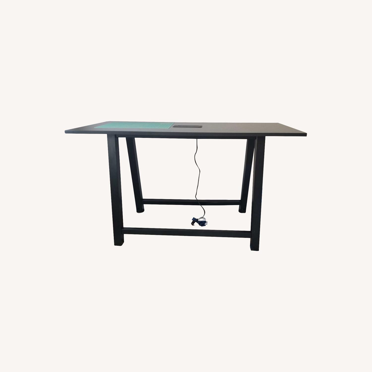 Seller's Notes:This is a great standing height conference table with a powered grommet in the center for easy electrical access. The table has a minor scratch on the edge of the grommet and a small corner of the laminate top is broken. Everything is in perfect working condition.