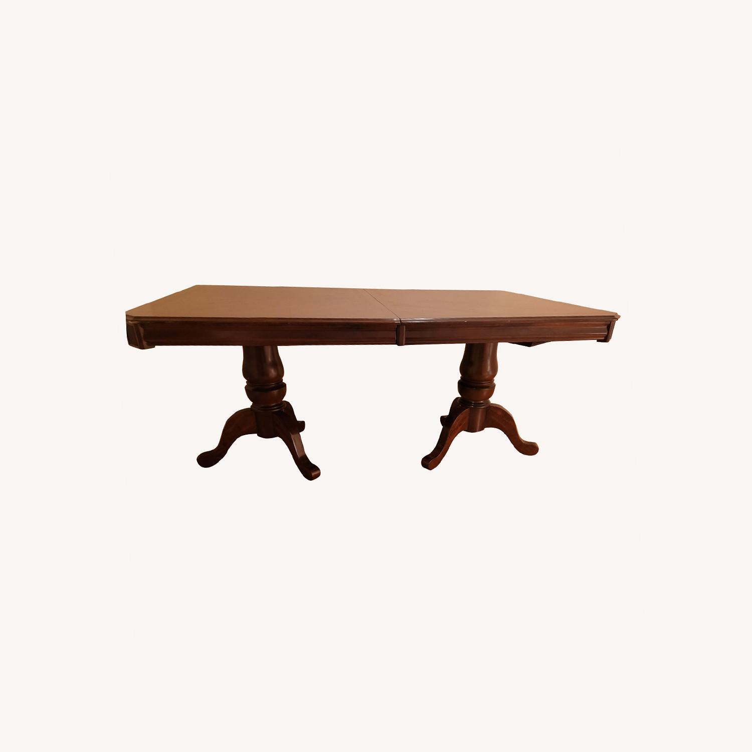 Seller's Notes:Beautiful dining table that was gifted to us "pre-pandemic". We are downsizing to a smaller table. Not pictured is the 18" inch leaf (included). Comfortably seats 6 could easily seat 8 with included leaf.