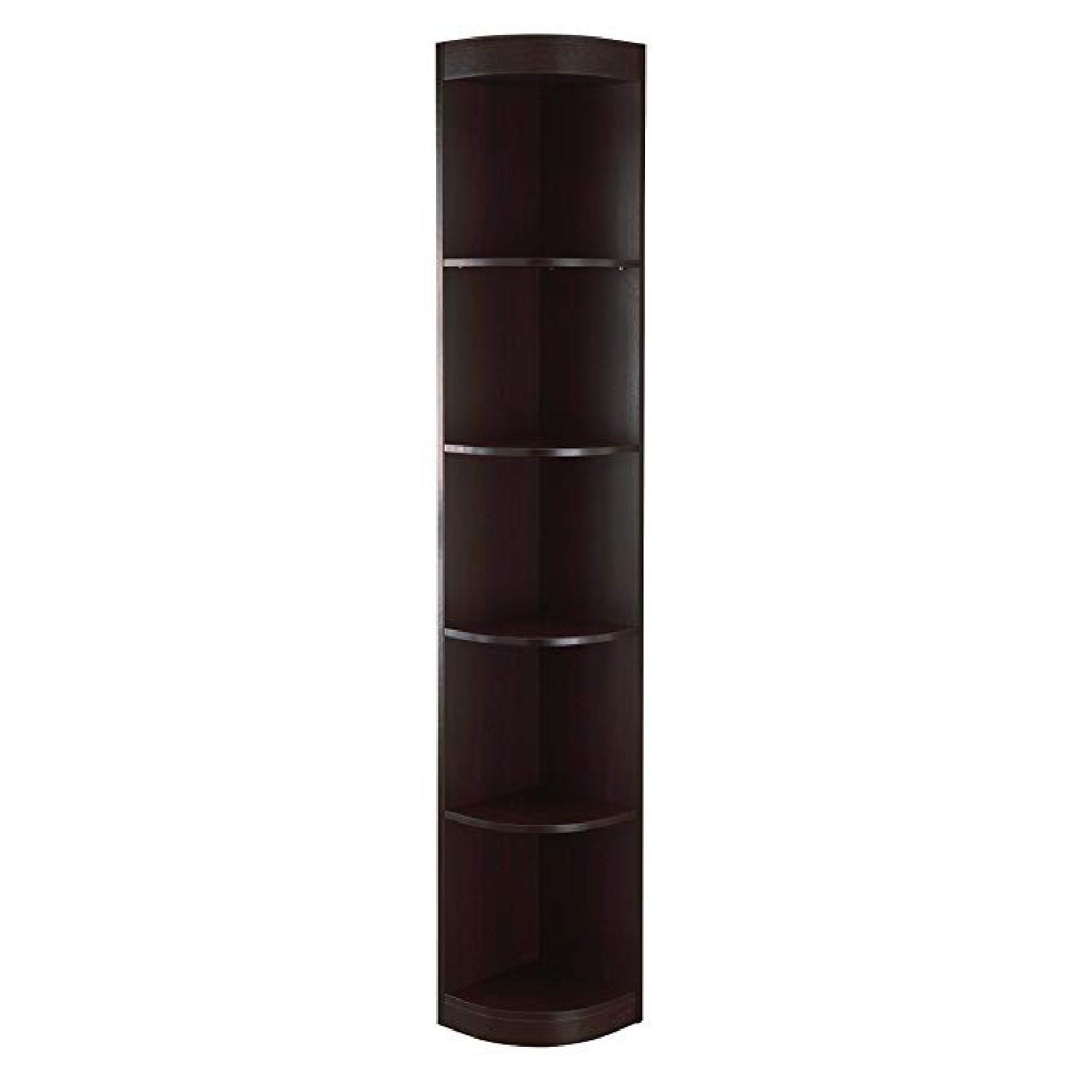 Seller's Notes:Store and exhibit your books and other belongings in this simple but elegant wooden display stand. Constructed from wood and veneer, this stand features five shelves and a rounded space saving design that will tuck neatly into a corner or against a wall. Available in various finishes to easily match your style, this stand is perfect for smaller spaces and rooms with a transitional decor. Features: Corner shelf display stand Rounded space-efficient design Constructed with 5 shelves Shelves work for storage and display Available in coffee bean, white, or dark walnut finish Transitional style Made with solid wood, MDF and veneer Dimensions: Shelves: 11 inches deep Height between each shelf: 12.5 inches high Overall: 12 inches wide x 12 inches deep x 77 inches high