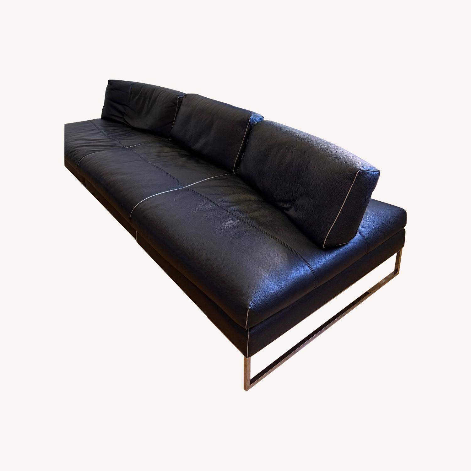 Seller's Notes:This blue leather sofa is in great condition, it has depth-adjustable seats and curved shape. Manufactured in Italy by Gamma Arredamenti, this seating solution is designed to encourage a unique layout of living spaces through its functional and stylistic novelty. With intricate stitching, it creates linear patterns for a geometrically inspired touch.