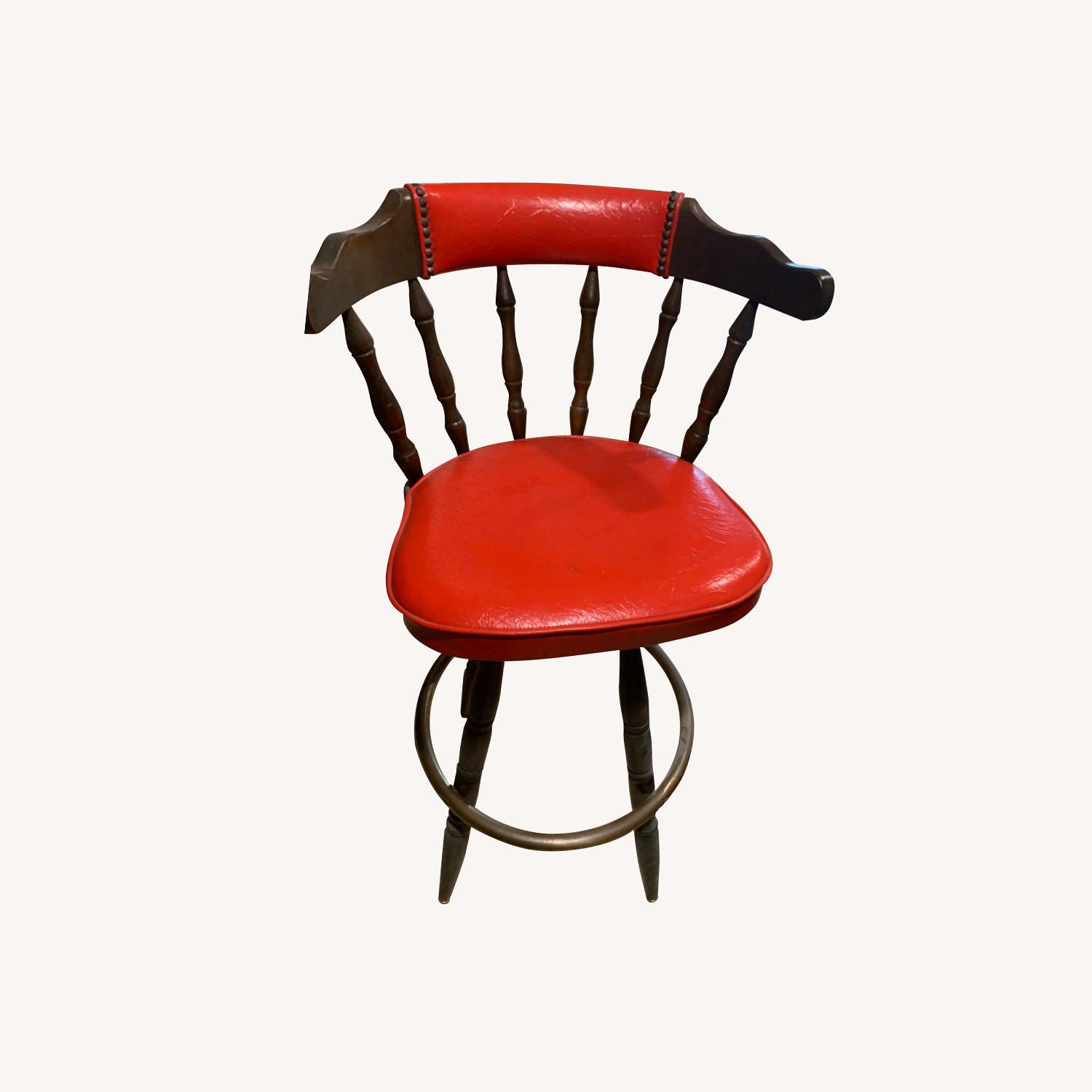 Seller's Notes:red vinyl , solid wood with brass foot rest Swivel bar stools