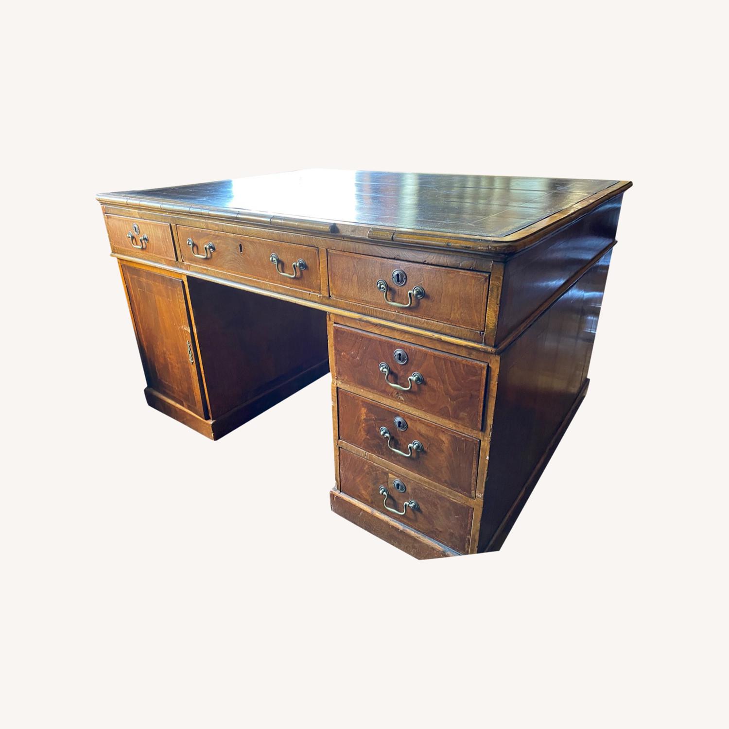 Seller's Notes:George III Gilt tooled brown leather lined walnut pedestal partners desk. Circa 1800. Height: 30.5" Width: 53" Depth: 39.75" I have had the desk for over 30 years, it's a great piece, but no longer works for me in this space. It comes in three pieces, the top detaches from from the two pedestals at either end. Let me know if you have any questions or need further photos.