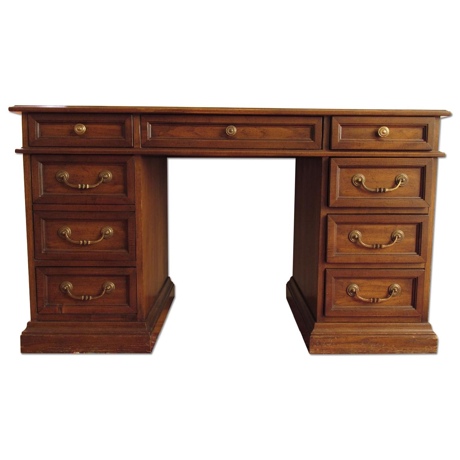 Seller's Notes:Leather inset top raised on two banks of drawers. Desk interior measures 21" wide, 23.5" high, 26" deep. Has small stain on top from object being placed on it.
