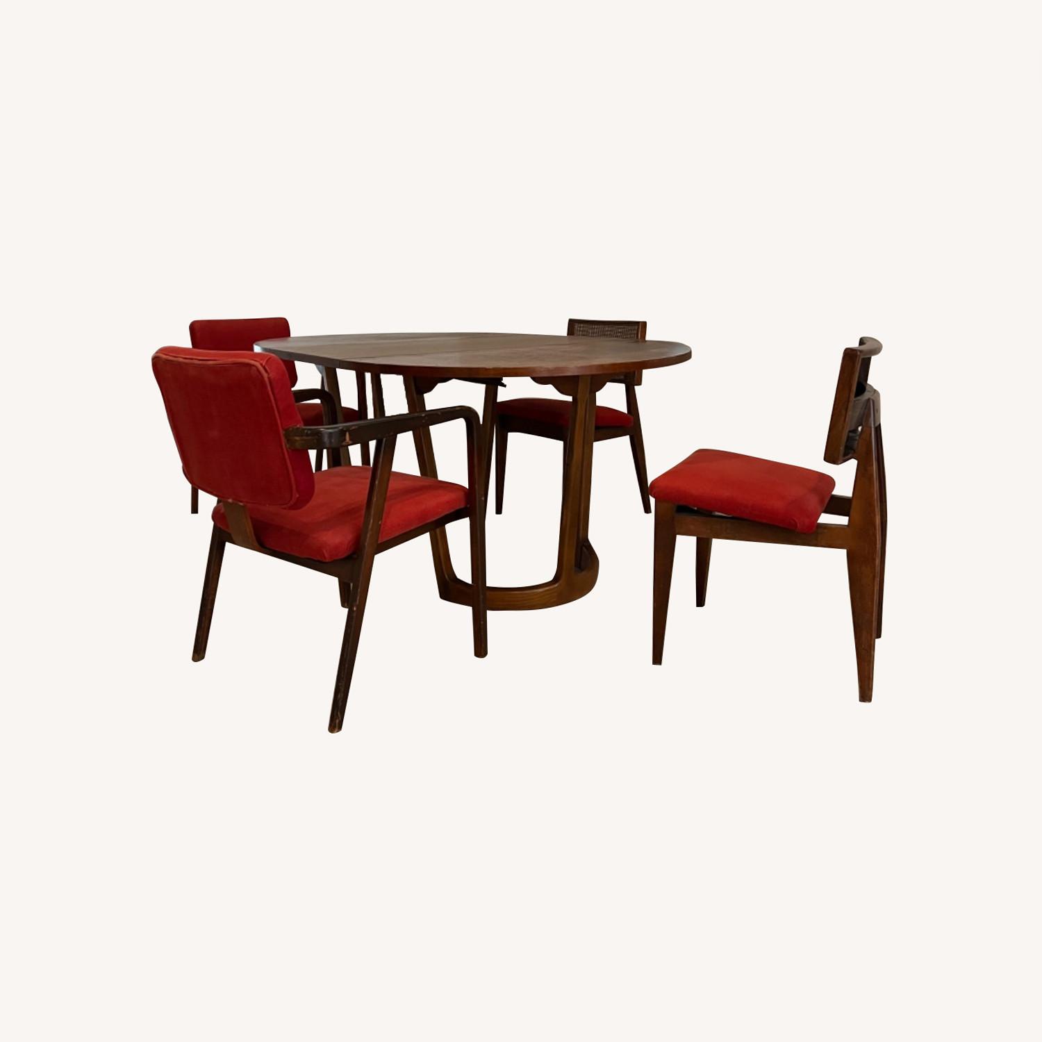 Seller's Notes:Mid-century modern Ernest Farmer for George Nelson dining chairs (4 in set) with a round walnut table that extends from 44 to 62 or 80 inches. Complete with pads to protect table surface. Chairs can be loved as they are or reupholstered/refinished for a more refined look. Small hole in caning of one of the chairs (see pic). Tabletop has stains probably from water glasses.